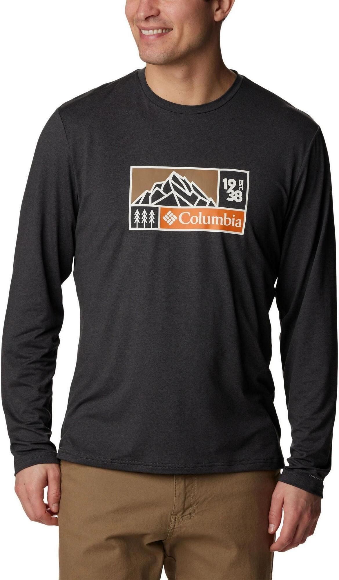 Tech Trail Long Sleeve Graphic to męska techniczna koszulka sportowa z długim rękawem marki Columbia z dużym nadrukiem na piersi.