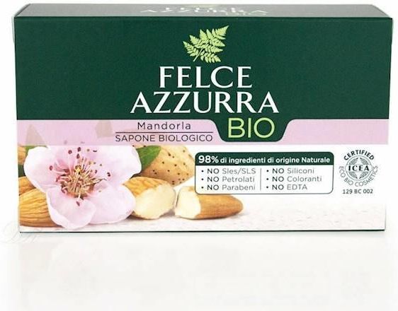 Mydło FELCE AZZURRA BIO Almond 125g Felce Azzurra Almond to naturalne mydło w kostce z dodatkiem migdałów. Delikatna formuła mydła, opracowana zgodnie ze standardami naturalnych kosmetyków, doskonale pielęgnuje skórę i idealnie nadaje się do codziennego użytku. Zawartość organicznej mąki migdałowej działa na skórę jak peeling, czyniąc ją jedwabiście gładką. 98% składników pochodzenia naturalnego; testowane dermatologicznie; bez GMO; nadaje się do recyklingu. Felce Azzurra, stworzona przez dom perfumeryjny Paglieri, należy do grona najbardziej renomowanych marek chemii gospodarczej oraz kosmetyków we Włoszech. Felce Azzurra to długoletnia tradycja, która utrwaliła się w świadomości wielu pokoleń. Jej kultowe produkty charakteryzują się unikalnymi kompozycjami zapachów, z ponad stu składników z całego świata. Firma posiada w swojej bogatej ofercie: płyny do prania i płukania ubrań, balsamy, kremy, dezodoranty, żele pod prysznic, talki, odświeżacze powietrza, jak również profesjonalne środki czystości dla domu.