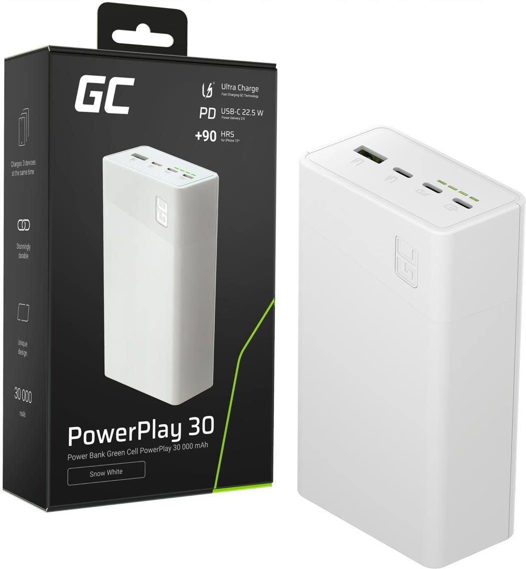 Moc 22,5W ✅ Pojemność 30000 mAh ✅ Szybkie ładowanie 3x USB-C ✅ USB-A ✅Funkcja passthrough ✅ Polski producent Powerbank Green Cell PowerPlay 30 Biały 22,5W 30000mAh Szybkie ładowanie - technologia ładowania Quick Charge 3.0 i Ultra Charge sprawią, że szybko uzupełnisz energię w swoich urządzeniach. …