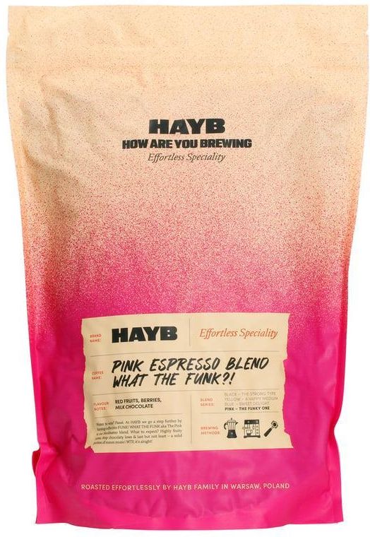 HAYB Pink Espresso Blend kawa ziarnista 1KG Na wstępie chcemy Ci bardzo podziękować za zainteresowanie naszą ofertą. Jeśli zawsze kupujesz produkty oryginalne, pochodzące z legalnych źródeł to dobrze trafiłeś bo mamy dla Ciebie świetną ofertę. HAYB – PINK ESPRESSO BLEND WTF kawa ziarnista 1KG Producent: HAYB EAN: 5904844570130 Opakowanie: 1 kg Pochodzenie: Etiopia, Brazylia Rodzaj kawy: Ziarnista Arabica / Robusta: 100% Arabica Obróbka: Natural, Washed Stopień palenia ziaren: Średni Przeznaczenie: Espresso Letnia, funkowa eksplozja owoców, kwiatów i słodyczy! To mieszanka dwóch rodzajów arabiki jakości speciality z Etiopii oraz Brazylii, wypalonych przez warszawską palarnię HAYB. Kawa palona w średnim stopniu, świetnie sprawdzi się do ekspresu ciśnieniowego i kawiarki. W jej smaku można wyczuć lekkie nuty mleczna czekolada, jagoda, truskawka. Idealnie sprawdzi się w klasycznym espresso, kawach mlecznych oraz w espresso tonic i espresso affogato. Kraj: Etiopia, Brazylia Metoda obróbki: Natural / Washed Nuty smakowe: Mleczna Czekolada, Jagoda, Truskawka Skład: 50% Ethiopia Guji (natural), 50% Brasil Cerrado What the f-NOWY FUNK! HAYB dorasta i na parkiecie nie kręci już brejka na głowie, a raczej porusza się z gracją i pewnie. Wciąż ma ten groove. Dlatego postanowiliśmy zmienić skład naszego najbardziej funky blendu i lekko go wygładzić. Wypolerować. Spokojnie, dzikie ruchy i szaleńcze łamańce nie zniknęły z parkietu – zostały w Ethiopii Natural Espresso. Tam znajdziesz dużo owoców, które tutaj zostały zbalansowane gęstym body kawy z Brazylii i jej czekoladowymi nutami. Tu wszystko jest równo zmiksowane – gramy z deków 50/50! Ta kawa to ideał dla ludzi szukających owocowych smaków, ale ze słodką bazą. Na słuchawkach Don Beto i Fela Kuti, w filiżance odświeżony WTF – zapraszamy do tańca!