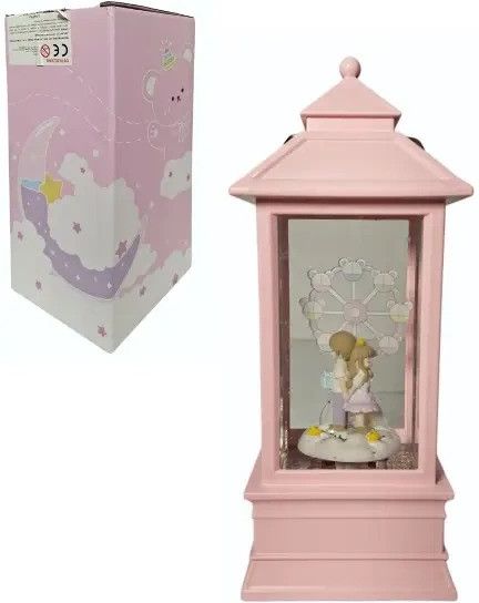 Różowa latarenka z figurką dziewczynki i chłopca w środku, stojących na chmurce z diabelskim młynem w tle. Elegancka dekoracja z brokatem, zapakowana w kartonowe pudełko. Po włączeniu lampka świeci i gra uspokajającą melodię, a brokacik unosi się. Podane wymiary są wymiarami opakowania. Wiek: …