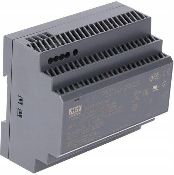 Zasilacz HDR-150-24 prądu stałego - napięcie wejściowe 230V AC , wyjściowe 24V DC 6,25A . Montaż na szynie DIN ( TS35 ) Zasilacz HDR-150-24 to wydajny i niezawodny zasilacz DIN, przeznaczony do pracy w trudnych warunkach. Zasilany z sieci 1x230V AC, dostarcza stabilne napięcie wyjściowe o wartości 24V DC i maksymalnym prądzie 6,25A. Urządzenie charakteryzuje się szerokim zakresem temperatury pracy, od -30°C do 70°C, co sprawia, że idealnie nadaje się do zastosowań przemysłowych oraz w projektach wymagających wysokiej niezawodności zasilania. Seria HDR wyróżnia się solidną konstrukcją oraz doskonałą efektywnością energetyczną, co przekłada się na długą żywotność urządzenia. Zasilacz HDR-150-24 to doskonały wybór dla profesjonalistów, którzy poszukują wydajnych rozwiązań zasilających w różnych aplikacjach. Parametry Napięcie wyjściowe: 24 [ VD C ] Prąd wyjściowy: 6,25 [ A ] Napięcie zasilające : 230 [ V AC ] Prąd wejściowy zasilacza: 1,6 [ A ] Rodzaj napięcia wejściowego: 1 fazowe Moc zasilacza: 142,5[ W ] Zabezpieczenie przeciążeniowe : TAK Zabezpieczenie zwarciowe: TAK Zabezpieczenie nadnapięciowe: TAK Zabezpieczenie termiczne: NIE Budowa zasilacza ( elektryczna ): impulsowy Sposób montażu: na listwę DIN Sprawność ( typowa ): 89 [ % ] Typ chłodzenia zasilacza: Swobodny przepływ