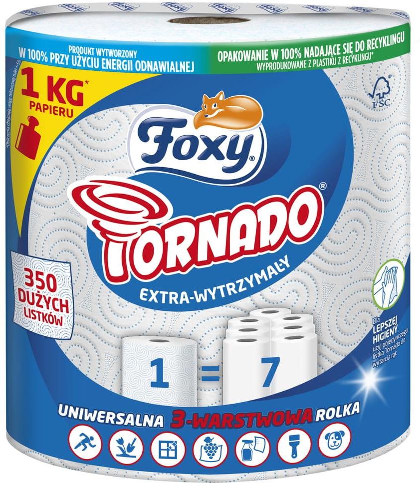 {desc/100/} Ręcznik Papierowy FOXY TORNADO - 1 szt. {desc/50/} {desc/50/} Foxy Tornado To ręcznik uniwersalny, dla tych, którzy nie rezygnują z wysokiej jakości 3 warstw. Połączenie 3 warstw i innowacyjnych superchłonnych spirali daje Foxy Tornado niezwykłą chłonność i wytrzymałość. Jedna rolka Foxy Tornado odpowiada 7 rolkom zwykłego ręcznika kuchennego, jest przy tym łatwa w obsłudze i może być używana w różnych pomieszczeniach w domu. 1 Rolka = 7 Rolek Zwykłego Ręcznika {desc/50/} Specyfikacja Bardzo wytrzymały, nie pozostawia śladów 350 listków, Bardzo długi Materiał: 100% Czysta Celuloza 3 Warstwy Długość Rolki: 82,2 m Wymiary Listka: 23,5 cm x 22,6 cm Super chłonne spiralne tłoczenie Gwarantowany do kontaktu z żywnością Może być używany w kuchence mikrofalowej Certyfikat FSC® {desc/50/} {desc/50/} {desc/50/} Certyfikat FSC FSC jest międzynarodową organizacją non-profit, która promuje odpowiedzialne zarządzanie światowymi lasami. Certyfikat FSC świadczy o tym, że produkty drzewne (takie jak papier, drewno) pochodzą z lasów zarządzanych w sposób zrównoważony, co obejmuje aspekty środowiskowe, społeczne oraz ekonomiczne. Posiadanie certyfikatu FSC przez produkt lub firmę jest gwarancją przestrzegania wysokich standardów ekologicznych i etycznych w zakresie pozyskiwania surowców. {desc/50/} Zaletowość 3 Warstwowa Konstrukcja Praktyczna Rolka: Większa od zwykłej ale nie za duża Nie zostawia włókien: Może być używany do mycia luster, okien itd. Higieniczny: Pozwala uniknąć przenoszenia się bakterii na innych użytkowników Specjalny wzór tłoczenia Gwarancja bezpiecznego Kontaktu z żywnością Może być używany w kuchenkach mikrofalowych Dekorowany Super chłonne spiralne tłoczenie Bardzo wytrzymały, nie pozostawia śladów {desc/50/} {desc/50/} {desc/50/} Uniwersalny Może być używany nie tylko w kuchni jako zwykły ręcznik kuchenny czy do sprzątania, ale również do dezynfekcji powierzchni, ocierania potu po aktywności fizycznej, podczas prac ogrodniczych czy majsterkowania, do sprzątania po zwierzętach {desc/50/} Starcza do 7 razy dłużej Jedna rolka Foxy Tornado odpowiada 7 rolkom zwykłego ręcznika kuchennego. {desc/50/} {desc/50/} {desc/50/} Higieniczny Używaj go do wycierania rąk zamiast tradycyjnych ręczników materiałowych, aby wyeliminować ryzyko rozprzestrzeniania się bakterii. {desc/50/} Gwarantowany do kontaktu z żywnością Ręczniki Foxy są odpowiednie do kontaktu z żywnością, co gwarantują rygorystyczne testy przeprowadzane w wykwalifikowanych laboratoriach. {desc/50/} {desc/50/} {desc/50/} Foxy - z nami lepiej Włoska marka Foxy to jeden z najważniejszych producentów artykułów służących utrzymaniu codziennej higieny. Sympatyczny lisek, będący rozpoznawczym znakiem firmy już od początku jej założenia w latach 80. XX wieku, jest doskonale znany w wielu krajach świata. Wysokiej jakości i trwałości oraz przyjemną miękkość czy zastosowanie delikatnych, miłych kompozycji zapachowych.