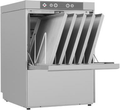 wydajność: 60/40/20 koszy/h; 5 programów standardowych (cykle: 120”, 240”, 360”, 480”, 600”) + 3 programy specjalne; wbudowana pompa spustowa; miary kosza: 500 x 600 mm; wysokość otworu drzwi: 405 mm; maksymalna wysokość talerza: 380 mm; dwupłaszczowa obudowa; zużycie wody: 2,4 l/cykl; ramiona myjąco - płuczące typu „Click-clack” na potrójnych łożyskach grafitowych: prosta, jednolita budowa kompozytowa; sterowanie elektroniczne - inteligentny panel sterowania; podgląd temperatury mycia i płukania na wyświetlaczu, termostop - gwarantowana temperatura płukania wg HACCP; tłoczona wanna; automatyczny start po zamknięciu drzwi; program samoczyszczenia; dozownik środka myjącego i płuczącego sterowany czasowo; kontrolki pracy i grzania; regulowany termostat bojlera; kosze w zestawie: 1x uniwersalny; pakiet chemii w promocyjnej cenie przy zakupie ze zmywarką