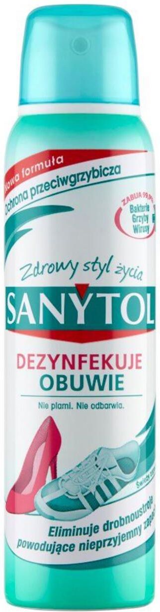 SANYTOL DEZODORANT DO OBUWIA 150 ML. Sanytol Aerozol dezynfekuje obuwie 150 ml Dezodorant Do Dezynfekcji Obuwia – Świeży ZapachButy są siedliskiem bakterii, pleśni i grzybów będących źródłem nieprzyjemnych zapachów, chorób i podrażnień skóry.SANYTOL Dezodorant do dezynfekcji obuwia eliminuje przykre zapachy dzięki swojej unikalnej formule. Dokładnie dezynfekuje i pozostawia przyjemne uczucie świeżości. Cechy produktu: Eliminuje 99,9% bakterii, grzybów (będących źródłem nieprzyjemnych zapachów) i wirusów Dezynfekuje i usuwa nieprzyjemny zapach obuwia Zabija między innymi grzyby i wirusy odpowiedzialne za: grzybice, brodawki, stopę atlety, itp. Nie brudzi, nie odbarwia i nie zostawia tłustych plam Bez chloru Pozostawia delikatny, świeży zapach. Opakowanie:150ml Produkt ma potrójne działania Działalnie bakteriobójcze zgodnie z normą EN 13697 (5 min, 18-25°C), Działanie grzybobójcze zgodnie z normą 13697 (5 min, 18-25°C). Ograniczone działanie wirusobójcze zgodnie z normą EN 14476 (30 min, 20°C).