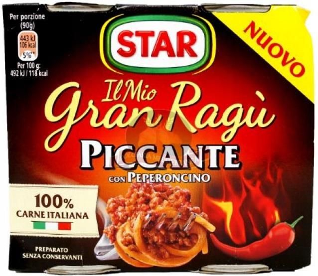 termin przydatności: 30.06.2027 STAR GRAN RAGU Ostry Sos do Makaronu Peperoncino 2x180g STAR GRAN RAGU Ostry Sos do Makaronu Peperoncino 2x180g to wyrazisty, gotowy sos do makaronu, stworzony z myślą o miłośnikach włoskiej kuchni i pikantnych smaków. Idealnie komponuje się z ulubionym makaronem, oferując autentyczne włoskie doznania kulinarne. Kluczowe cechy produktu: Składniki najwyższej jakości: sos zawiera 28% mięsa (15% wołowiny i 13% wieprzowiny), koncentrat pomidorowy (15,5%), świeże warzywa (marchew, cebula, seler), olej słonecznikowy oraz 2,5% papryczki chili, co nadaje mu charakterystyczną ostrość. Naturalny skład: produkt nie zawiera konserwantów i jest bezglutenowy, co czyni go odpowiednim dla osób z nietolerancją glutenu. Wygodne opakowanie: dwie puszki po 180g każda, idealne do przygotowania dwóch porcji dania.