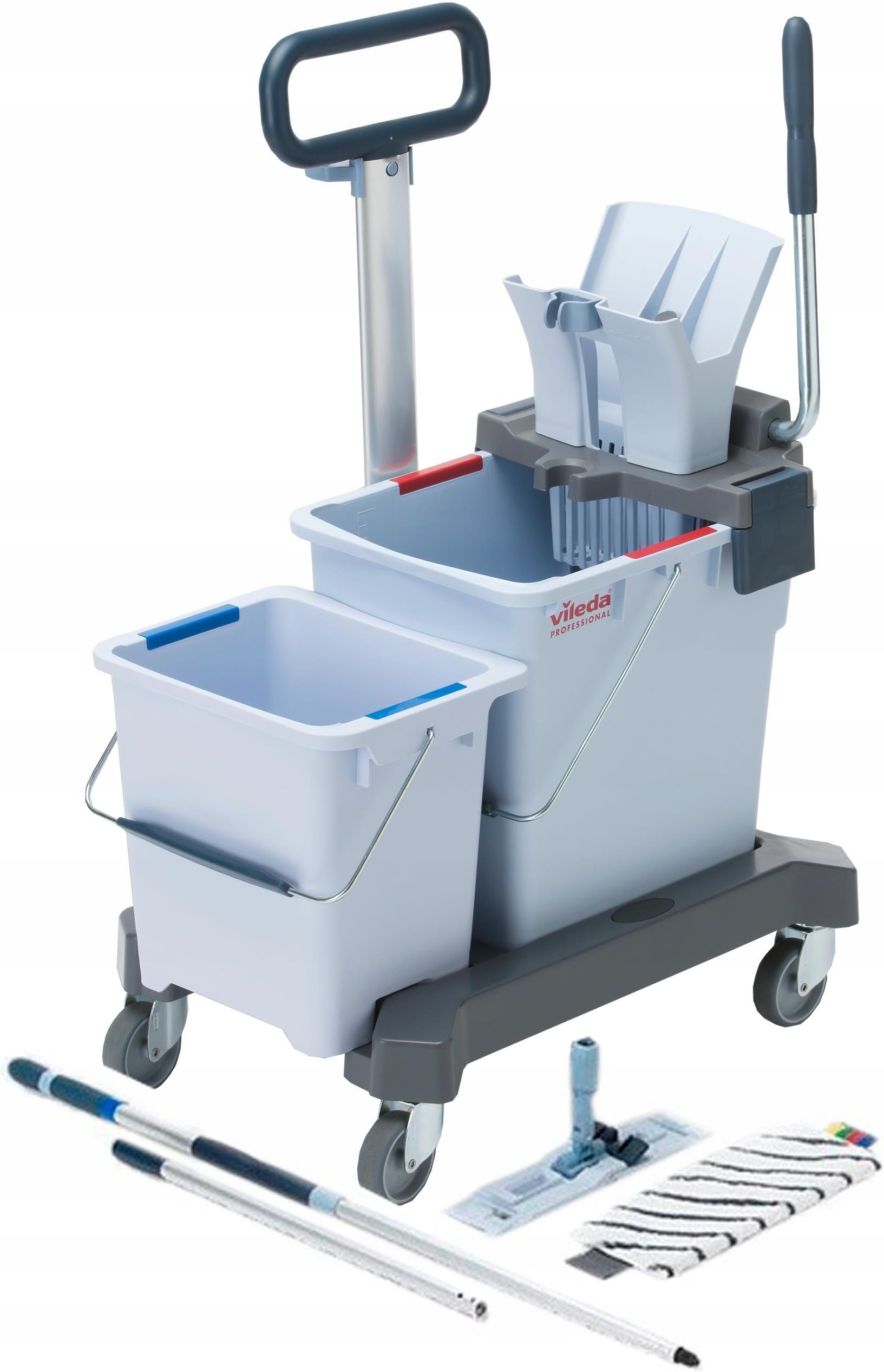 UltraSpeed Pro Double Bucket Ready to Go (MicroLite mop) UltraSpeed Pro Double MicroLite Mop Ready to Go zawiera platformę jezdną, wiadro 25l i 8l, prasę, prowadnicę, uchwyt do mopa, mop i kij teleskopowy. Drugie wiadro umożliwia mocowanie prasy albo między wiadrami albo z tyłu systemu. Dzięki unikalnemu profilowi z przodu i z tyłu zapobiega ściekaniu wody między wiadrami w dowolnej konfiguracji. Alternatywnie, jeśli chcesz wykonać więcej czynności, możesz wykorzystać drugie wiadro do transportu środków chemicznych, ścierek, papieru itp. Dostępna jest ergonomiczna prowadnica, a wszystkie zestawy można stosować z różnymi mopami z mikrowłókien oraz specjalistycznymi mopami do czyszczenia podłóg bezpieczeństwa. Jest idealnym narzędziem dla wszystkich, którzy chcą zwiększyć wydajność swojego sprzątania. Ten wózek został specjalnie zaprojektowany, aby ułatwić i przyspieszyć proces sprzątania w pomieszczeniach o większej powierzchni. Specyfikacja Szybsze wyciskanie - prosty w obsłudze system wyciskania, przyśpieszający dwukrotnie czynność Wydajna prasa (wyciskarka)- uwalnia do 50% wody Szybkość schnięcia powierzchni - podłoga wysycha szybciej zmniejszając niebezpieczeństwo poślizgu Higiena - brak kontaktu dłoni z detergentami Łatwy w użyciu - nie wymaga szkolenia Ergonomiczna konstrukcja - podczas pracy nie wymaga pochylania się Dwuwiaderkowa wersja najszybszego systemu mopowania UltraSpeed Pro Innowacyjne drugie wiadro umożliwia opcjonalność ustawienia prasy (w środkowym lub w tylnym położeniu) Zestaw UltraSpeed Pro Double Bucket System Push zawiera: platformę jezdną, wiadro 25 l i 8 l, prasę, prowadnicę, Microlite mop oraz drążek teleskopowy Zalety produktu Dwuwiadrowa wersja najszybszego systemu mopowania Szybkie wyciskanie - proste i dwa razy szybsze Wydajna prasa - wyciska do 50% więcej wody Podłogi schną szybciej, co ogranicza ryzyko poślizgnięcia się Higieniczna metoda sprzątania bez dotykania mopów czy roztworu czyszczącego Łatwa w użyciu - nie wymaga szkolenia Ergonomiczna i lekka - nie wymaga schylania się w celu wyciśnięcia mopa Wytrzymałość Wózek ten jest wykonany z trwałych materiałów, które zapewniają długotrwałą wytrzymałość i niezawodność. Ma on ergonomiczną rączkę, dzięki czemu łatwo go prowadzić, a jednocześnie jest stabilny i odporny na uszkodzenia. Posiada również specjalne uchwyty na mopy, dzięki czemu można łatwo zmieniać używane narzędzia do sprzątania. Funkcjonalność Wózek sprzątający do mopa ma również praktyczną półkę, na której można przechowywać narzędzia do sprzątania lub środki czystości, co pozwala na zwiększenie wydajności sprzątania. Dodatkowo, dzięki swoim poręcznym wymiarom, wózek ten jest łatwy do przechowywania i transportowania. Idealny dla twoich potrzeb! Jeśli szukasz sprzętu, który pozwoli Ci zaoszczędzić czas i zwiększyć efektywność swojego sprzątania, ten wózek sprzątający do mopa jest idealnym rozwiązaniem dla Ciebie. Nie przegap tej okazji, aby zdobyć wyjątkowe narzędzie do sprzątania i zwiększyć swoją wydajność już dziś! JAKOŚĆ VILEDA PROFESSIONAL Proszę zwrócić uwagę, iż oferowany produkt jest produktem z linii VILEDA PROFESSIONAL (kolor niebieski), różni się on większą trwałością oraz wytrzymałością od linii Vileda Consumer (kolor czerwony).