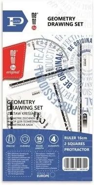 Czteroelementowy szkolny zestaw kreślarski. W każdym zestawie 2 standardowe przezroczyste ekierki 16 cm 45/60 stopni, kątomierz 10 cm/180 stopni oraz linijka 16 cm.Elementy zestawu posiadają trwałą nieścieralną podziałkę i zaokrąglone rogi dla bezpieczeństwa użytkownika. Precyzyjny nadruk skali (do 0,001 cm). Wykonane z plastiku o odpowiednim stosunku twardości do elastyczności zapewniającym wysoką odporność na złamania. Pakowane w woreczki z zawieszką.