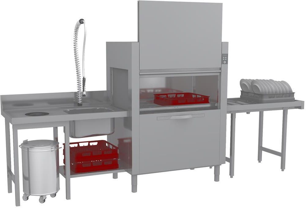 Prędkość: 160/120/80/60 koszy /h (elektroniczna kontrola prędkości przesuwu koszy); konstrukcja dwupłaszczowa, nierdzewna; wymiary kosza: 50 x 50 cm (w zestawie: 1x na szkło, 1x na talerze); wysokość otworu wsadowego 450 mm (wysokość szklanki: 370 mm, talerza: 400 mm); modułowa konstrukcja PROMONT …