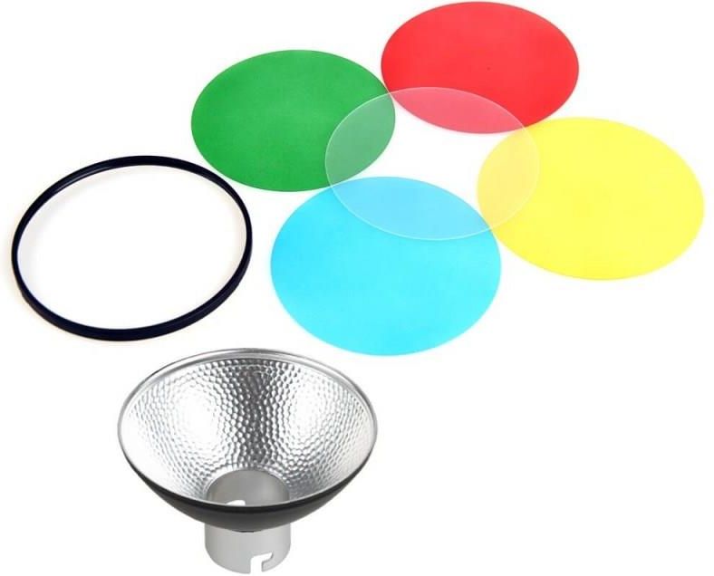 Godox AD-M to standardowy mini reflektor o średnicy 104 mm kompatybilny z serią Godox Wistro, w tym AD180, AD360, AD360II i AD200. Mini czasza pozwala na większe skupienia wiązki światła z lampy błyskowej, zapobiega rozpraszaniu się światła na boki, a wraz z kolorowymi filtrami zapewnia ciekawe i urozmaicone oświetlenie. W zestawie z reflektorem znajdują się cztery filtry kolorowe: żółty, czerwony, niebieski i zielony oraz dyfuzor.