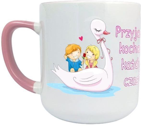 Kubek w kolorze białym z różowym uchem i różowym środkiem. Napis: Przyjaciel kocha w każdym czasi e Produkt można myć w zmywarce, jednak ze względu na specyfikę nadruku i różny stopień działania środków czyszczących oraz soli w zmywarkach mechanicznych zalecamy mycie ręczne. Materiał: ceramika …