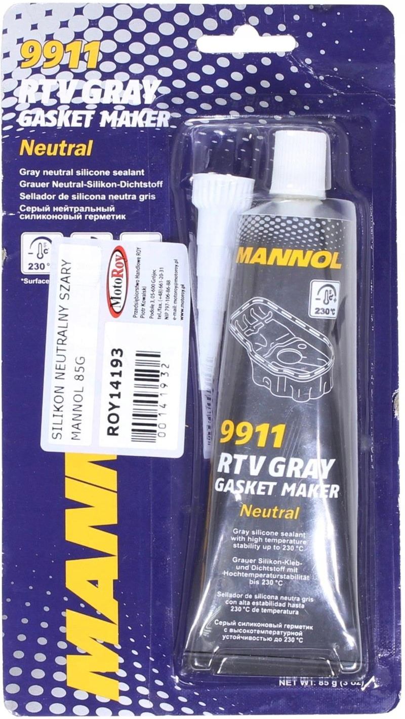 MANNOL Gasket Maker Grey Neutral 9911 Wysokiej jakości jednoskładnikowy uszczelniacz silikonowy twardniejący w temperaturze pokojowej. Posiada doskonałą odporność na niskie i wysokie temperatury, nie traci plastyczności przez cały okres użytkowania. Zapewnia niezawodną wodoodporną izolację. Odporny na smary, płyny niezamarzające, wodę i paliwo. Odporny na zginanie powierzchni. Zastępuje uszczelnienia azbestowe, gumowe, papierowe, korkowe i metalowe. Może być skutecznie stosowany do naprawy następujących elementów: pompy wody, kołnierze pomp olejowych, obudowy termostatów, miski olejowe, przekładnie itp. Powierzchnię do malowania należy odtłuścić. Po 24 godzinach połączenie może być obciążone. Zakres temperatur pracy od - 40 °C do +230 °C (przerywanie). Przechowywać produkt w chłodnych i suchych warunkach w szczelnie zamkniętym oryginalnym opakowaniu.