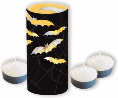 Lampion na pogrzewacz, świeczkę z nadrukiem pajęczyn oraz wyciętymi nietoperzami. - Owijka w kolorze czarnym. - Posiada trzystopniową regulację obwodu. - Po złożeniu tworzy coś w rodzaju lampionu dla świeczek, zwłaszcza podgrzewaczy lub małych lampek. - Znakomita dekoracja na Halloween, przyjęcie w …