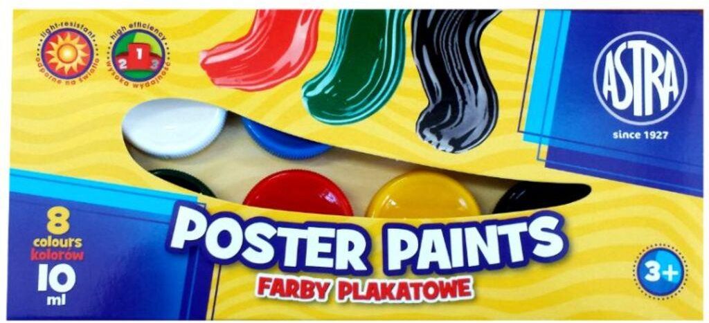 Farby plakatowe są farbami wodnymi, kryjącymi o czystych i intensywnych barwach. Ze względu na znakomitą przyczepność, nadają się do malowania na takich podłożach jak: papier, karton, drewno, ceramika, kamień. Wymalowane powierzchnie po wyschnięciu są matowe o intensywnych barwach, odporne na działanie światła i ścieranie. Konsystencja farb plakatowych (pasta) pozwala na wykonywanie prac w różnych technikach np.: impasto, fakturowanie, malowanie farbą rozcieńczoną i innymi. Wysoką jakość farb uzyskujemy dzięki bardzo dobrym pigmentom i spoiwom użytym do produkcji tych farb, oraz technologii produkcji. Pojemność: 8x10ml.