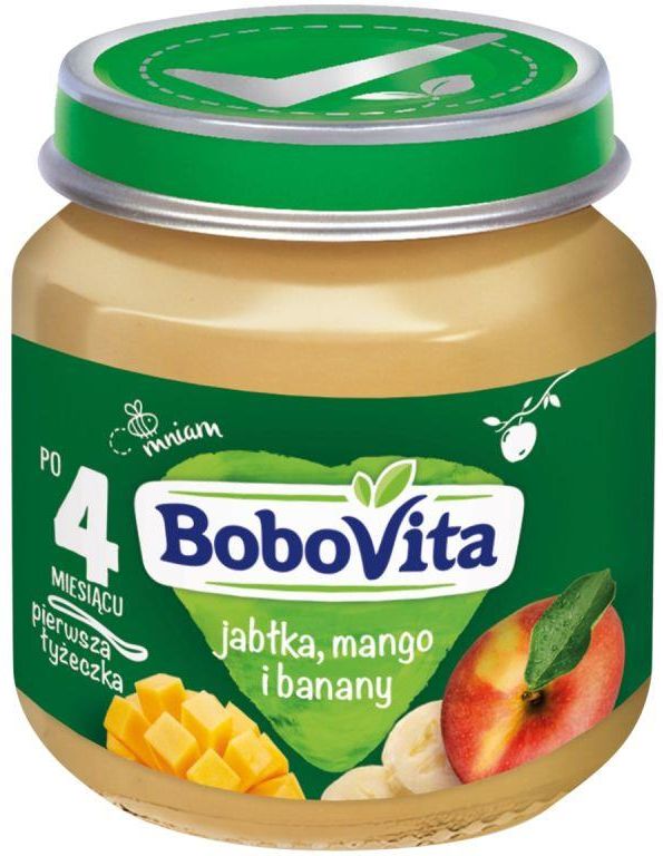 BOBOVITA Jabłka, mango i banany po 5. miesiącuWskazania:Bobovita jabłka, mango i banany po 5. miesiącu to deserek dla niemowląt od 5. miesiąca życia przeznaczony w celu rozbudowania diety. Właściwości:Bobovita jabłka, mango i banany po 5. miesiącu to pyszny deserek z kawałkami owoców dla niemowląt. Produkt zawiera składniki skontrolowane pod kątem bezpieczeństwa dla niemowląt. Zgodnie z przepisami prawa nie zawiera konserwantów, barwników i wzmacniaczy smaku. Bobovita jabłka, mango i banany po 5. miesiącu spełnia rygorystyczne normy jakościowe dla najmłodszych. Jego delikatna konsystencja i skład są odpowiednie do wieku. Nie zawierają konserwantów, barwników i wzmacniaczy smaku. Bez dodatku cukru. Zawierają owoce od sprawdzonych dostawców. Deserek zawiera tylko owoce, biszkopt (bez cukru) i witaminę C. Jego skład został starannie dostosowany do potrzeb dziecka.Skład:Składniki Bobovita jabłka, mango i banany po 5. miesiącu: owoce 94% (jabłka 60%, mango 20%, banany 14%), woda użyta do przygotowania, mąka ryżowa, sok cytrynowy z zagęszczonego soku, witamina C.Wartość odżywcza w 100 g: wartość energetyczna 244 kJ/58 kcal; tłuszcz 0,1 g, w tym kwasy nasycone 0 g; węglowodany 13 g, w tym cukry 9,8 g; błonnik 1,3 g; białko 0,5 g; sól