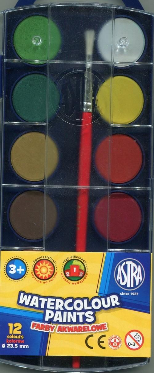 Farby akwarelowe 12 kolorówFarbyakwarelowe to farby na bazie wody, które służą do malowania na papierze. Są one dostępne w postaci suchych guzików, które tworzą gotowe do użycia kolory niemal natychmiast po zwilżeniu wodą. Farby akwarelowe składają się z wysokiej jakości, drobno zmielonych pigmentów, które są połączone rozpuszczalnym w wodzie spoiwem. Oprócz pigmentów i spoiw, farby akwarelowe zawierają również wypełniacze, które sprawiają, że farba matowieje po wyschnięciu. Farby akwarelowe mogą być używane w technikach łączonych z farbami temperowymi, farbami plakatowymi i kredkami woskowymi.Zalety:nieprzezroczyste kolory na bazie wodyintensywne kolorywysoka jakość drobno zmielonych pigmentówmożliwość łączenia z temperami, farbami plakatowymi i kredkami woskowymimatowe po wyschnięciuodporne na światłoParametry:Kolor: wielokolorowyŚrednica krążka: 23,5 mmIlość: 12 sztukDługi okres trwałościKrótki czas schnięciaSzczotka w zestawiePrzeznaczenie: do treningu dzieci, w profesjonalnych studiach Akwarelowe farby wodne do malowania na papierze - okrągłe suche guziczki farby umieszczone są w plastikowej kasetce. Farba po zwilżeniu wodą jest gotowa do użycia. Farby są wykonane z drobno roztartych pigmentów, które połączone zostały rozpuszczalnym w wodzie spoiwem. Farby akwarelowe to farby wodne służące do malowania na papierze. Mają one postać suchych guziczków, z których po zwilżeniu wodą niemal natychmiast uzyskuje się gotowe do użycia farby. Akwarele szkolne ASTRY składają się z wysokiej jakości drobno roztartych pigmentów, połączonych rozpuszczalnym w wodzie spoiwem. Oprócz pigmentów i spoiw akwarele szkolne zawierają pewne ilości wypełniaczy, które sprawiają, że farba wysychając matowieje. Dzięki temu nakładając farbę grubiej można malować technikami zbliżonymi do gwaszu, a w większych rozcieńczeniach technikami charakterystycznymi dla akwareli. Akwarele można wykorzystywać w technikach łączenia z farbami temperowymi, plakatowymi i kredkami woskowymi ASTRY. Akwarele ASTRY przeznaczone są głównie dla dzieci i młodzieży szkolnej rozpoczynającej edukację plastyczną. Dzięki swej postaci mogą być łatwo przenoszone np. w uczniowskich tornistrach oraz przechowywane przez długi czas bez obawy zmiany właściwości. * kryjące farby wodorozcieńczalne * intensywne kolory * wysoka jakość drobno roztartych pigmentów * możliwe łączenie z farbami temperowymi, plakatowymi i kredkami woskowymi ASTRA * po wyschnięciu matowieją * odporne na światło Paleta z 12 farbami akwarelowymi Astra z pędzelkiem. Kolory są bardzo dobrze napigmentowane, a średnica każdego z nich wynosi 23,5 mm. Pędzelek nadaje się do rysowania małych obszarów, linii i różnych szczegółów.