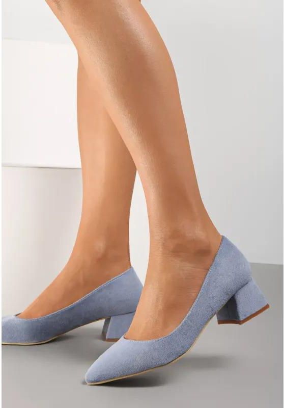 Czółenka Kallomela na stożkowym obcasie, wykonane z ekozamszu w jednolitym kolorze. Ze szpiczastym, eleganckim noskiem. Wkładka z ekoskóry, znacząco zwiększająca komfort noszenia. Dodadzą Ci mnóstwa kobiecości i optycznie wysmuklą nogi. Noś je w zestawie z sukienkami mini typu kopertowe lub bodycon! Najlepiej leżą na wąskiej stopie. Kolor: Niebieski Tęgość stopy: Wąski Rodzaj obcasa: Stożek Wkładka/wyściółka: Ekoskóra Materiał: Ekozamsz Nosek buta: Szpiczasty Zapięcie: Wsuwany/otwarty Sezon: Całoroczny Wysokość obcasa: 4.5cm