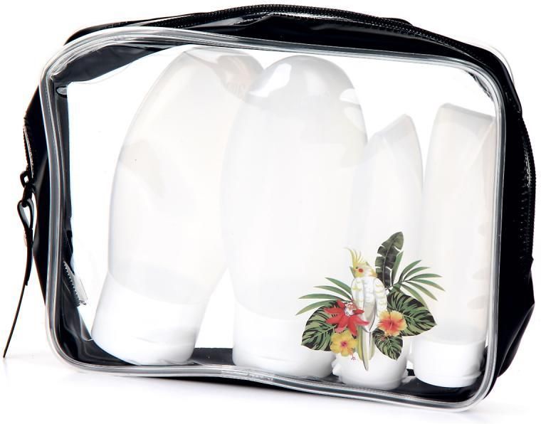 Przygotuj się do drogi! Dla wszystkich nie mogących się doczekać upragnionych wakacji. - zestaw butelek podróżnych w kosmetyczne - przezroczyste pojemniki i kosmetyczka - ozdobiona wzorem w papugę nimfę, kwiaty i egzotyczne rośliny - kosmetyczka zamykana na zamek błyskawiczny - butelki: – większa, 2 szt. – mniejsza, 2 szt. - pojemność: 89 ml, 30 ml - materiał: polietylen, tworzywo PVC - wymiary kosmetyczki (wysokość x szerokość x głębokość): 12x16,5x4 cm