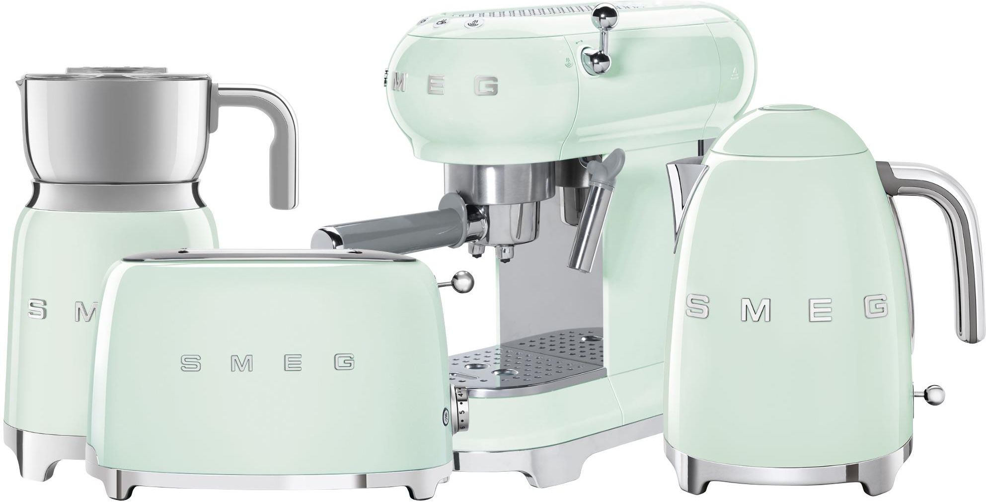 Zestaw z ekspresem i spieniaczem do mleka 50's Retro Style w kolorze zielonym. W zestawie znajdują się też czajnik KLF03 i toster na 2 kromki. Idealny do porannych posiłków.