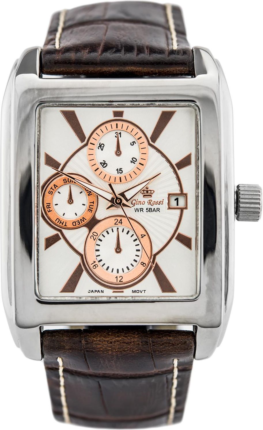 Opis: zegarek męski GINO ROSSI 6464 7BZ Mechanizm: Kwarcowe MIYOTA made in japan - zasilany baterią. Koperta: wykonana z wysokiej jakości stali, stop ten charakteryzuje się najwyższym stopniem odporności na korozję. Szkiełko: wysokiej jakości szkiełko mineralne, odporne na zarysowania - wypukłe. Pasek: skórzany, wysoka jakość. Datownik: wskaźnik dnia miesiąca. Neobride: fosforyzowane wskazówki świecące w ciemności. Wodoszczelność: 5BAR. Odporny na deszcz i zachlapania. Kolorystyka: koperta: srebrna tarcza: srebrna pasek: brązowy Wymiary: koperta : szerokość 36mm, wysokość 49mm szerokość paska: 24mm grubość zegarka: 11mm obwód zegarka od 16,5cm do 22cm obwód nadgarstka, na którym przedstawiony jest zegarek to 16cm Gwarancja: Na zegarek jest udzielana 24 miesięczna gwarancja. Dodatkowe informacje: Plating IPS/IPG: jonowa metoda nakładania powłoki zegarka, pozwalająca na uzyskanie jednolitej gładkości powierzchni o podwyższonej odporności na ścieranie. Nickel free: zegarek nie uczula - antyalergiczny.