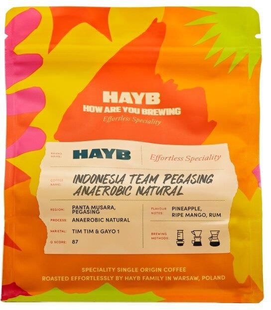 Kawa specialty z Indonezji poddana obróbce beztlenowej fermentacji Anaerobic Natural, która nadała jej egzotycznego charakteru. HAYB Indonesia Team Pegasing Natural to jasno palona arabika do przelewowych metod parzenia.