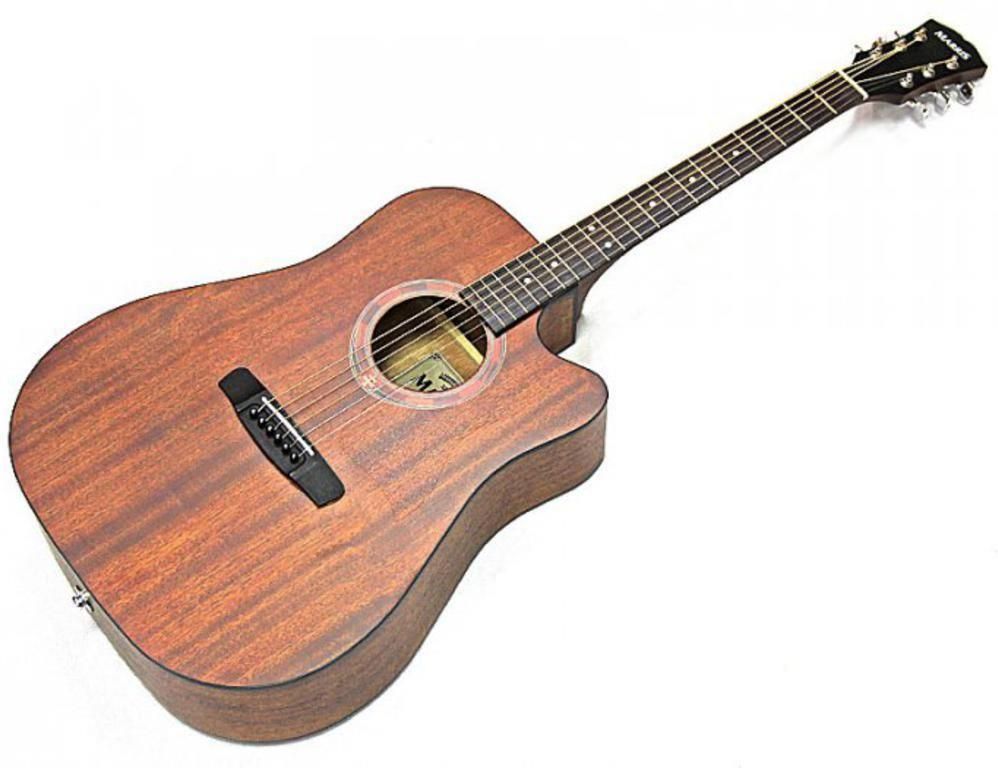 MARRIS DCE M - Gitara elektroakustyczna Firma Marris słynie z świetnie wyselekcjonowanego drewna, które zapewnia ciepłe, głębokie brzmienie. Wszystkie elementy instrumentów są bardzo precyzyjnie wykonane, dzięki czemu gitary są bardzo wygodne. Model DM to duże pudło dreadnought grające pełnym, szerokim pasmem. SPECYFIKACJA: Rodzaj pudła: dreadnought z cutawayem Płyta wierzchnia: mahoń Tył i boki: mahoń Gryf: mahoń Podstrunnica: palisander Menzura: 25,5" Ilość progów: 20 Osprzęt: chromowany Elektronika: Marris Struny: metalowe (daddario EXP) Kolor: naturalny matowy