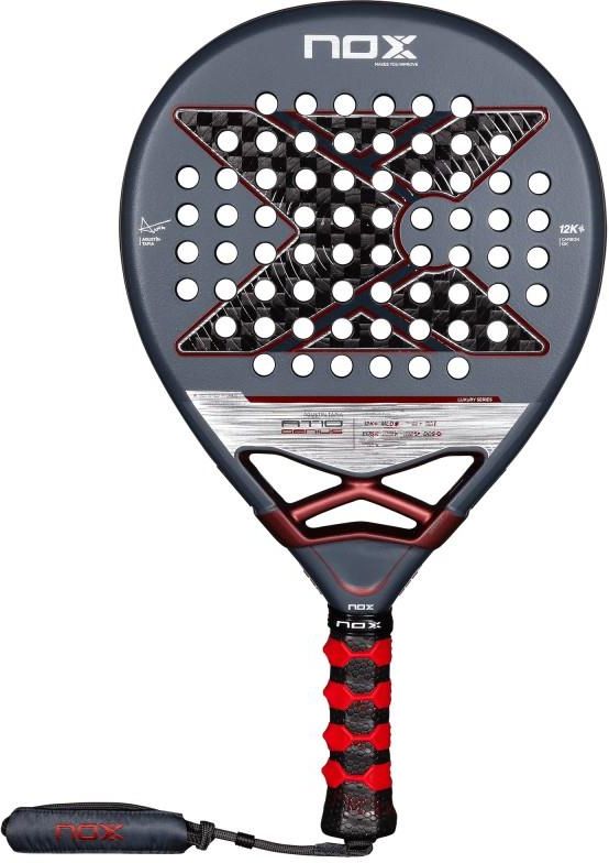 Rakieta NOX AT10 Genius 12K 2025 to efekt współpracy z jednym z czołowych zawodników padla, Agustínem Tapią. Zaprojektowana z myślą o sezonie 2025, skierowana jest do graczy pragnących bardziej solidnego i sztywnego odczucia podczas uderzeń. Dzięki zastosowaniu włókna węglowego 12K na powierzchni oraz wielowarstwowego rdzenia MLD Black EVA, rakieta zapewnia średnio-wysoką twardość i doskonałe czucie piłki. Technologia EXCLUSIVE SPIN z podwójnym wykończeniem powierzchni – heksagonalnym 3D w centrum i teksturą piasku na pozostałej części – umożliwia nadawanie piłce większej rotacji, zwiększając kontrolę nad grą. Dodatkowo, system EOS Flap optymalizuje manewrowość rakiety i efektywnie rozkłada jej wagę, tworząc szybkie i precyzyjne narzędzie na korcie. Innowacyjna technologia NOX Custom Grip®, certyfikowana przez Testea Padel, oraz system Pulse przyczyniają się do absorpcji wibracji, redukując zmęczenie stawów i zwiększając komfort gry. Ponadto, rakieta wyposażona jest w pionierski system wymiennego paska bezpieczeństwa Smartstrap®, co zwiększa higienę i umożliwia pełną personalizację bez utraty gwarancji. Wybierając NOX AT10 Genius 12K 2025, inwestujesz w rakietę, która podniesie Twój poziom gry, oferując niezrównaną moc, kontrolę i komfort użytkowania. Dołącz do grona profesjonalistów i poczuj różnicę z rakietą zaprojektowaną z myślą o zwycięstwach. Szczegółowa specyfikacja produktu Kształt: Łza Waga: 360–375 g Rama: 100% włókno węglowe Powierzchnia: Włókno węglowe 12K Rdzeń: Wielowarstwowa pianka MLD Black EVA Wykończenie powierzchni: Technologia EXCLUSIVE SPIN z podwójną teksturą (heksagonalne 3D w centrum i tekstura piasku na pozostałej części) Dodatkowe technologie: NOX Custom Grip® Pulse System Smartstrap® EOS Flap Przeznaczenie: Gracze poszukujący równowagi między mocą a kontrolą
