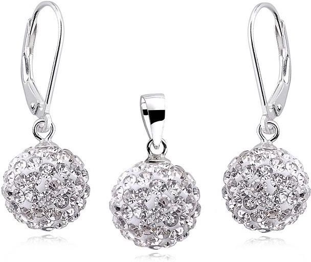 Elegancki wiszący srebrny komplet kulek o średnicy 10mm, wysadzanych białymi kryształkami Swarovski, składający się z kolczyków na angielskim zapięciu oraz wisiorka, model CRH0001DZ10.