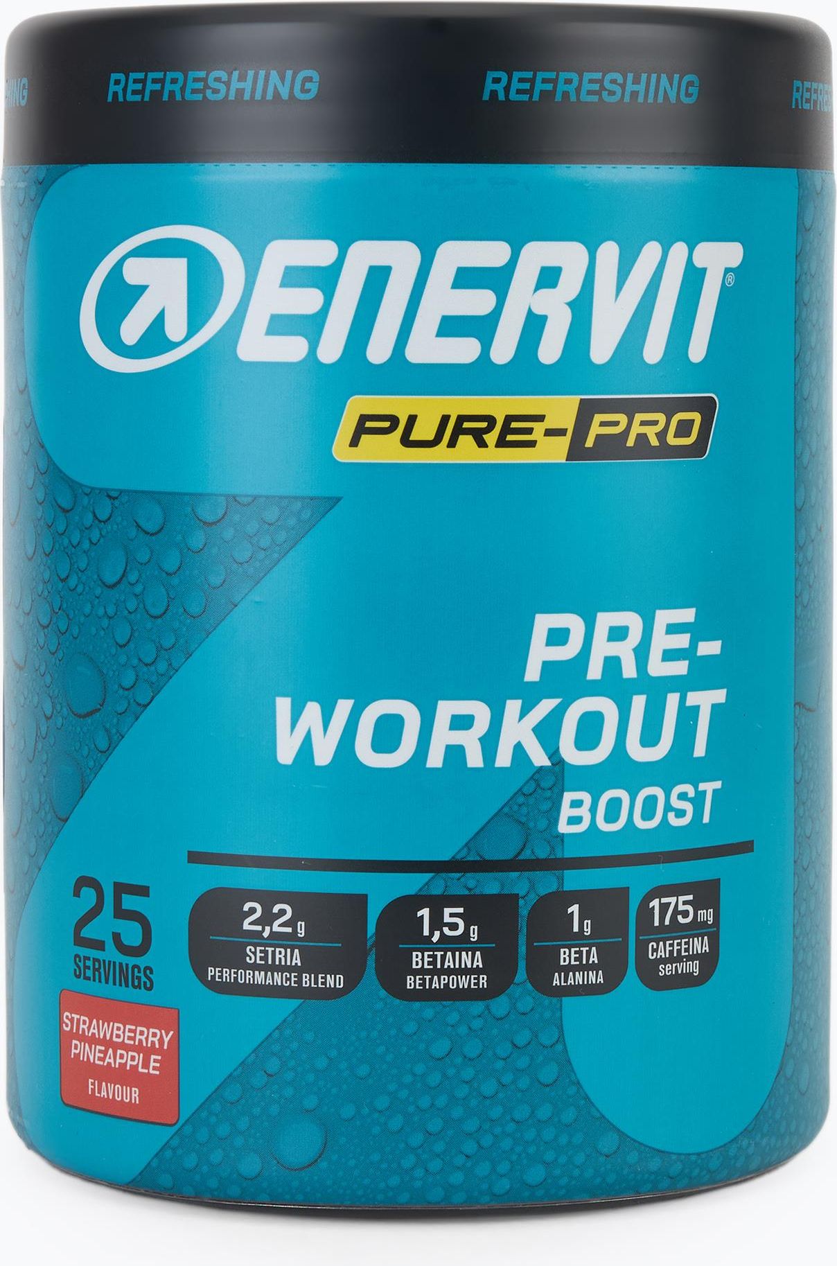 PRZEDTRENINGÓWKA ENERVIT PURE-PRO PRE-WORKOUT BOOST POMPA SIŁA ENERGIA SMAK: TRUSKAWKA-ANANAS OPAKOWANIE: 313g Enervit PURE-PRO Pre-Workout Boost To zaawansowany suplement diety stworzony dla sportowców dążących do maksymalizacji swojej wydajności. Dzięki starannie dobranym składnikom, takim jak kofeina, betaina Betapower® i mieszanka Setria® Performance Blend, ten produkt zapewnia energię i koncentrację niezbędną przed intensywnym treningiem. 175 mg kofeiny dla zwiększenia czujności i koncentracji. 2,2 g Setria® Performance Blend wspomagającej wydolność fizyczną. 1,5 g betainy Betapower® wspierającej funkcje mięśni. 1 g beta-alaniny dla opóźnienia uczucia zmęczenia mięśniowego. naturalne aromaty o pysznym smaku truskawkowo-ananasowym. Enervit PURE-PRO Pre-Workout Boost To zaawansowany suplement diety w proszku, stworzony z myślą o intensywnych treningach. Dzięki unikalnej formule wspomaga zwiększenie energii, siły i wytrzymałości, przygotowując organizm na intensywny wysiłek. Enervit PURE-PRO Pre-Workout Boost w swoim składzie zawiera: Beta-alaninę: aminokwas, który pomaga zwiększyć wydolność mięśniową, opóźniając pojawianie się zmęczenia. Kofeinę: naturalny stymulant, który zwiększa czujność i koncentrację, poprawiając ogólną wydolność fizyczną. L-Argininę: aminokwas wspomagający produkcję tlenku azotu, co prowadzi do rozszerzenia naczyń krwionośnych i lepszego ukrwienia mięśni podczas treningu. Sposób użycia Zaleca się spożycie jednej porcji (~12,5 g) dziennie, rozpuszczając zawartość jednej miarki w około 300-400 ml wody, najlepiej 30 minut przed treningiem. Nie przekraczać zalecanej porcji do spożycia w ciągu dnia. Składniki Składniki: maltodekstryna, regulator kwasowości: kwas cytrynowy; betaina (Betapower®) 11,5%, aromaty naturalne, L-cytrulina, L-glutation zredukowany (Setria®) 8,5%, beta-alanina, L-arginina, L-tyrozyna, kofeina 1,3%, ekstrakt z korzenia żeń-szenia (Panax ginseng C.A. Meyer) 1%, ekstrakt z nasion guarany (Paullinia cupana Kunth) 1%, ekstrakt z liści mate (Ilex paraguariensis A. St.-Hil.) 1%, ekstrakt z nasion koli (Cola nitida (Vent.) Schott & Endl.) 1%, substancja słodząca: sukraloza; chlorek potasu, witamina B6 (chlorowodorek pirydoksyny), barwnik: koszenila. Uwagi Suplementy diety nie mogą być stosowane jako substytut zróżnicowanej i zbilansowanej diety oraz zdrowego stylu życia. Produkt zawiera kofeinę (175 mg na porcję) – nie zaleca się stosowania u dzieci, kobiet w ciąży i karmiących piersią. Przechowywać w miejscu niedostępnym dla małych dzieci. Wartości odżywcze w 1 porcji (13,4 g), % RWS* Setria® Performance Blend: 2,2 g, – L-Glutation Setria®: 200 mg, – L-Cytrulina Kyowa Quality®: 2 g, L-Arginina: 1 g, Betaina BetaPower®: 1,5 g, Beta-alanina: 1 g, Ekstrakt z guarany (nasiona), mate (liście) i kola (nasiona): 375 mg, – Zawartość kofeiny: 75 mg, Bezwodna kofeina: 100 mg, Ekstrakt z żeń-szenia (korzeń): 150 mg, – Ginsenozydy: 3 mg, Ekstrakt z winogron (Vitis vinifera L.): 100 mg, – Flawanole ogółem: 50 mg, – Flawanole monomeryczne: 12 mg, Enovita® – ekstrakt z pestek winogron (Vitis vinifera L.): 300 mg, – Proantocyjanidyny: 270 mg, – Flawanole monomeryczne: 30 mg, Witamina B6: 1,4 mg, 100% Witamina B12: 2,5 µg, 100% Niacyna: 16 mg, 100% Witamina C: 200 mg, 250% Potas: 302 mg, 15% Cynk: 1,5 mg, 15% *RWS – Referencyjna Wartość Spożycia