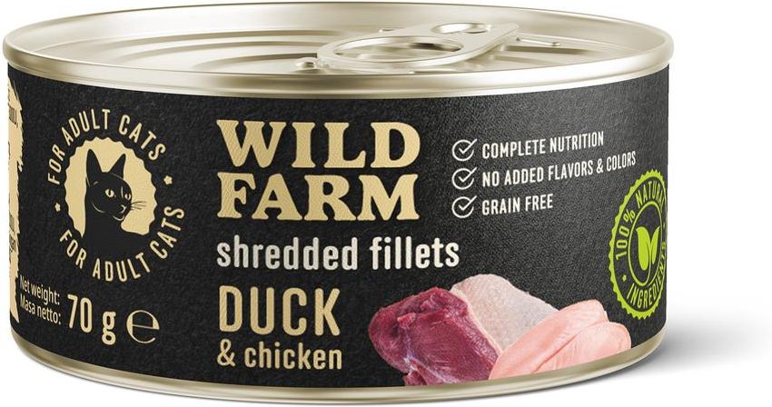 🦆🐔 Wild Farm Shredded Fillets Duck & Chicken 70g – filet z kaczki i kurczaka dla kotów Wild Farm Shredded Fillets Duck & Chicken to bezzbożowa, premium karma mokra dla dorosłych kotów, przygotowana w formie apetycznych filetów w bulionie. Starannie dobrana kompozycja 35% kaczki i 29% kurczaka zapewnia wysoką zawartość białka i wyjątkowy smak, któremu koty nie potrafią się oprzeć. Soczyste filety mają naturalny aromat mięsa, bez sztucznych zapachów i posmaków. Receptura została wzbogacona o olej z łososia, który dostarcza kwasów omega wspierających zdrową skórę i lśniącą sierść. Dodatek tauryny, L-karnityny oraz witamin i minerałów zapewnia wsparcie serca, metabolizmu, wzroku i odporności. To lekka i smakowita karma bez dodatku glutenu, barwników i aromatów, która sprawdzi się jako pełnowartościowy posiłek lub uzupełnienie codziennej diety kota. Najważniejsze zalety karmy: 35% kaczki i 29% kurczaka – naturalne źródła białka Filety w bulionie – wyjątkowy smak i wysoka wilgotność Olej z łososia – kwasy omega dla skóry i sierści Tauryna i L-karnityna – wspierają serce i metabolizm Bezzbożowa receptura, bez sztucznych barwników i aromatów Skład: Kaczka 35%, kurczak 29%, bulion mięsny 29%, olej z łososia, witaminy i minerały.Składniki analityczne: białko surowe 13%; tłuszcz surowy 4%; popiół surowy 2,5%; włókno surowe 1%; wilgotność 75%.Dodatki/kg: witamina A 4000 IU, witamina D3 300 IU, witamina E 150 mg, chlorek choliny 500 mg, cynk 30 mg, mangan 5 mg, DL-metionina 1500 mg, tauryna 800 mg, L-karnityna 50 mg.