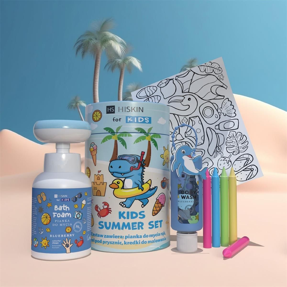 HISKIN Kids Zestaw Wakacyjny: Pianka do Mycia, Żel pod Prysznic, Kolorowe Kredki i Kolorowanki - Niebieski Odkryj radość z kąpieli dzięki naszemu wyjątkowemu zestawowi wakacyjnemu HISKIN Kids! Ten kolorowy zestaw zawiera wszystko, co potrzebne, aby umilić czas Twojemu dziecku podczas codziennych rytuałów pielęgnacyjnych. Pianka do mycia: Łagodna i delikatna formuła, która sprawia, że skóra jest czysta i nawilżona. Pachnąca malinami, zapewnia niezapomniane doznania zapachowe. Żel pod prysznic: Idealny do codziennego użytku, pozostawia skórę świeżą i pachnącą. Kolorowe kredki i kolorowanki: Kreatywna zabawa, która rozweseli każde dziecko i pozwoli na wyrażenie swojej wyobraźni. Aby skorzystać z pianki, umieść opakowanie na równej, stabilnej powierzchni. Usuń zabezpieczenie z pompki, a następnie naciśnij dozownik, aby uzyskać idealną ilość produktu. Po naciśnięciu, odwróć dłoń, aby zobaczyć piękny odcisk kwiatka. Pianka może być używana jak tradycyjne mydło lub żel pod prysznic. Przed pierwszym użyciem zalecamy kilkukrotne naciśnięcie dozownika, aby napełnić go zawartością. Pamiętaj, nasz produkt nie nadaje się do spożycia! Ciesz się bezpieczną i przyjemną kąpielą z HISKIN Kids!