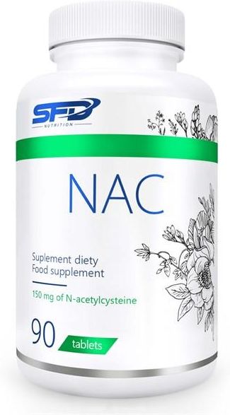 SFD, NAC, 90 tabletek - opis produktu SFD NAC, to wysokiej jakości produkt zawierający N-acetylocysteinę, cechującą się doskonałymi właściwościami prozdrowotnymi. Jest skierowany do osób, które myślą o poprawie regeneracji wątroby, detoksykacji organizmu czy też wspomaganiu regeneracji powysiłkowej. Zastosowanie: suplementacja N-acetylocysteiną jest szczególnie polecana sportowcom oraz osobom aktywnym fizycznie. Zalecane spożycie: 1 tabletka dziennie. Składniki: substancja wypełniająca: celuloza, N-acetylocysteina, substancja glazurująca: hydroksypropylometyloceluloza, substancja przeciwzbrylająca: sole magnezowe kwasów tłuszczowych, substancja glazurująca: glikol polietylenowy, substancja przeciwzbrylająca: glikol polietylenowy, substancja przeciwzbrylająca: dwutlenek krzemu. 1 tabletka zawiera: N-acetylocysteina 500mg. Przeciwwskazania: nadwrażliwość (uczulenie) na którykolwiek ze składników preparatu. Ważne wskazówki: Nie należy przekraczać dziennej zalecanej porcji do spożycia. Zrównoważona i zróżnicowana dieta oraz zdrowy styl życia są podstawą zapewnienia prawidłowego funkcjonowania organizmu. Suplement diety nie może być stosowany jako substytut (zamiennik) zróżnicowanej diety. Przechowywać w szczelnie zamkniętym opakowaniu, w suchym i ciemnym miejscu, w temperaturze pokojowej, w sposób niedostępny dla małych dzieci.