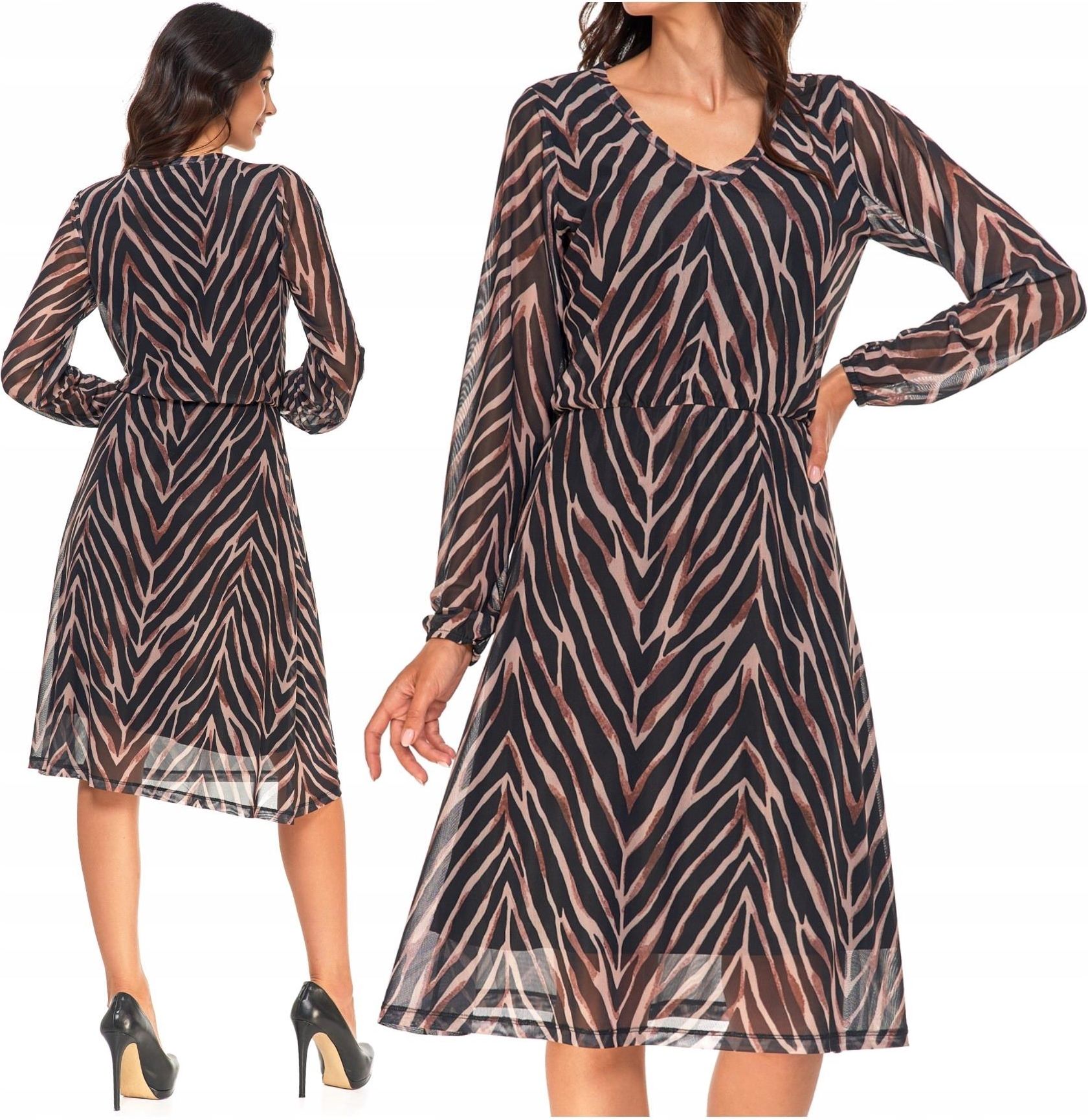 SUKIENKA DAMSKA MIDI Zwiewna Wzór Długi Rękaw Do Kolan WYGODNA MORAJ Sukienka damska midi w zwierzęcy wzór to propozycja dla kobiet, które cenią elegancję i oryginalny design. Wykonana z lekkiego, przewiewnego materiału, zapewnia komfort noszenia przez cały dzień. Zwierzęcy print w odcieniach brązu …