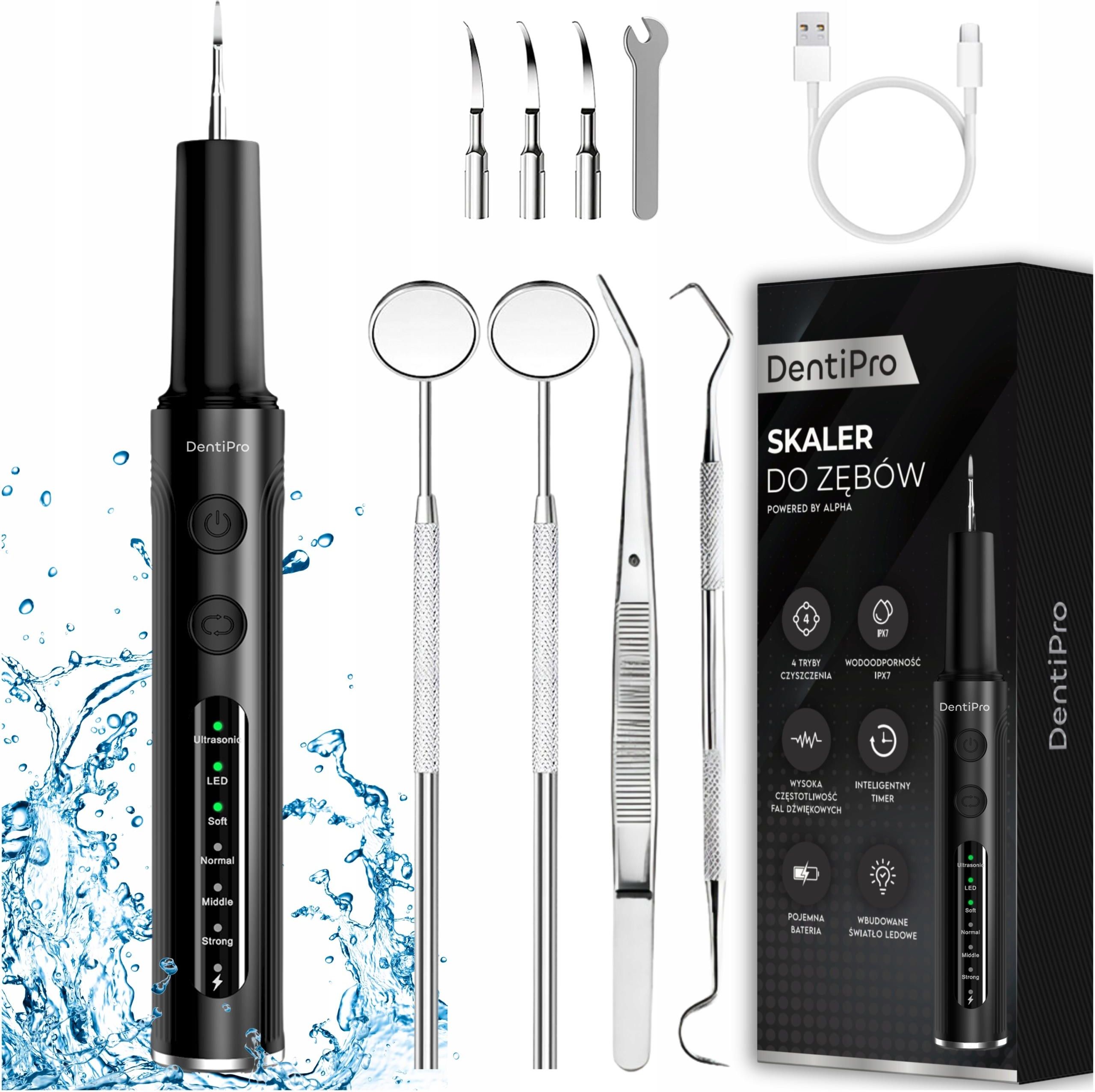 SKALER ULTRADŹWIĘKOWY DO ZĘBÓW - 4 TRYBY DO USUWANIA KAMIENIA NAZĘBNEGO ULTRADŹWIĘKOWY SKALER DO ZĘBÓW I DZIĄSEŁ DENTIPRO! Inteligentny skaler ultradźwiękowy do zębów DentiPro to profesjonalne urządzenie, które pomoże Ci w skutecznym i regularnym usuwaniu płytki nazębnej, kamienia nazębnego czy niechcianego osadu z powierzchni Twoich zębów. Pomoże w tym zaawansowana technologia wysokich wibracji, dzięki której w ruch wprawiona jest tylko końcówka a nie całe urządzenie. Moc urządzenia została z pomocą stomatologa przełożona na 4 tryby pracy, tak abyś Ty mógł skupić się na swoim uśmiechu. Skaler jest wodoodporny i wyposażony w 4 wymienne głowice oraz komplet narzędzi wspomagających, dzięki czemu możesz w zaciszu własnego domu przeprowadzić profesjonalny zabieg oczyszczania zębów, korzystając z narzędzi, które znajdziesz w najlepszych gabinetach dentystycznych. Urządzenie zostało również wyposażone w oświetlenie LED, dzięki czemu, dotrzesz do miejsc i zanieczyszczeń niewidocznych na pierwszy rzut oka. Skaler DentiPro wykorzystuje ultradźwiękową technologię, która działa na wysokiej częstotliwości. Dźwięk, który można usłyszeć, pojawia się dopiero po zetknięciu końcówki z zębem, gdy wibracje są przekazywane na powierzchnię zęba. Wcześniej urządzenie już pracuje, ale na niskiej częstotliwości, dlatego dźwięk może nie być słyszalny. ZALETY SKALERA DENTIPRO Wbudowane światło LED pozwoli Ci dotrzeć do miejsc niewidocznych na pierwszy rzut oka. Ultradźwiękowa technologia pozwoli Ci w bezpieczny sposób skutecznie usunąć kamień nazębny i osad z jamy ustnej, dzięki czemu możesz cieszyć się zdrowym i pięknym uśmiechem. 4 tryby intensywności pracy skalera pozwolą Ci na dobranie właściwego trybu pracy do potrzeb i wrażliwości Twoich zębów oraz dziąseł. Inteligentny timer automatycznie wyłączy urządzenie po 10 minutach ciągłej pracy, dzięki temu system zabezpiecza silnik przed przegrzaniem co wydłuża żywotność urządzenia. Kompletny zestaw akcesoriów, który zapewni Ci wszystko to, co jest konieczne, do dbania o zdrowie Twoich zębów. Zabieg za pomocą skalera ultradźwiękowego DentiPro jest bezpieczny i skuteczny. Wodoszczelność IPX7 umożliwia mycie urządzenia bezpośrednio pod strumieniem wody, co znacznie ułatwia konserwację. Cicha praca dla Twojego komfortu. Mobilność i łatwość obsługi TRYBY PRACY SKUTECZNIE USUWAJĄCE KAMIEŃ NAZĘBNY Skaler do zębów DentiPro posiada 4 tryby pracy, aby dopasować sposób czyszczenia do niemal każdych Twoich potrzeb. Impulsy elektryczne o ultradźwiękowej częstotliwości, wprawiają głowicę w drgania, co przekłada się na najskuteczniejszą domową metodę usuwania kamienia nazębnego. Do Twojej dyspozycji są następujące tryby: Soft - idealny tryb jeśli po raz pierwszy używasz skalera lub jeśli Twoje zęby są wrażliwe. Ten tryb zapewnia Ci delikatne, ale skuteczne czyszczenie. Normal - tryb stworzony do codziennej pielęgnacji jamy ustnej, który skutecznie i komfortowo usuwa płytkę nazębną. Middle - tryb o zwiększonej intensywności drgań, który bezpiecznie eliminuje większy osad nazębny, zapewniając dokładniejsze czyszczenie. Strong - to dedykowany tryb dla Ciebie, jeśli zmagasz się z dużym kamieniem nazębnym, idealny do głębokiego i intensywnego oczyszczania zębów. Istnieje wiele sposobów na utrzymanie odpowiedniej higieny jamy ustnej, jeśli jednak zależy Ci na uzyskaniu satysfakcjonujących efektów czyszczenia i maksymalnej świeżości, pomoże Ci w tym skaler DentiPro. Skuteczny w usuwaniu kamienia nazębnego i osadów w jamie ustnej. Zapobiega chorobom dziąseł i zębów w tym próchnicy i paradontozie. W bezpieczny sposób dla szkliwa usuwa osad i kamień z jamy ustnej. Poprawia wygląd Twoich zębów, czyste zęby to piękne zęby. Długotrwałe korzyści - urządzenie pozwala zaoszczędzić czas i środki na profesjonalnych wizytach u stomatologa. ZESTAW WYMIENNYCH GŁOWIC I AKCESORIÓW Zestaw został wyposażony w 4 wymienne głowice oraz narzędzia dentystyczne, dzięki czemu, w skuteczny i prosty sposób zadbasz o higienę jamy ustnej. Głowica płaska - skutecznie usuwa kamień i przebarwienia zajmujące większą powierzchnię Twoich zębów. Głowica spiczasta - precyzyjna głowica, która skutecznie usunie osad znajdujący się przy linii dziąseł oraz w trudnodostępnych miejscach. Sonda dentystyczna - jej głównym zadaniem jest wykrywane ubytków, próchnicy czy chorób dziąseł. Skrobak dentystyczny - pozwala w sposób manualny usuwać drobny kamień nazębny. Lusterko - pozwala na monitorowanie stanu uzębienia w trudno dostępnych miejscach oraz na monitorowanie postępów zabiegów z wykorzystaniem skalera. Akcesoria (wymienne głowice, narzędzia wspomagające) są umieszczone w różnych częściach opakowania – niektóre z nich mogą znajdować się na spodzie pudełka. Prosimy o dokładne sprawdzenie zawartości opakowania przed rozpoczęciem używania urządzenia. Q&A czyli popularne pytania i odpowiedzi 1. Dlaczego urządzenie "działa" dopiero po zetknięciu z zębami? Skaler DentiPro działa na ultradźwiękowej technologii, która generuje wibracje. Dźwięk jest słyszalny tylko wtedy, gdy urządzenie zetknie się z powierzchnią zęba. Przed tym momentem, urządzenie działa na niskiej częstotliwości, która jest niesłyszalna dla ludzkiego ucha. 2. Gdzie znajdują się akcesoria? Wszystkie akcesoria, w tym wymienne głowice i narzędzia wspomagające, znajdują się w różnych częściach opakowania. Część akcesoriów, takich jak narzędzia dentystyczne, może być umieszczona na spodzie pudełka ( pod białą ramką), więc warto dokładnie sprawdzić całą zawartość opakowania. 3. Jak zmienić tryby pracy urządzenia? Aby zmienić tryb pracy, należy nacisnąć przycisk ON/OFF. Każde naciśnięcie zmienia tryb urządzenia na inny. 