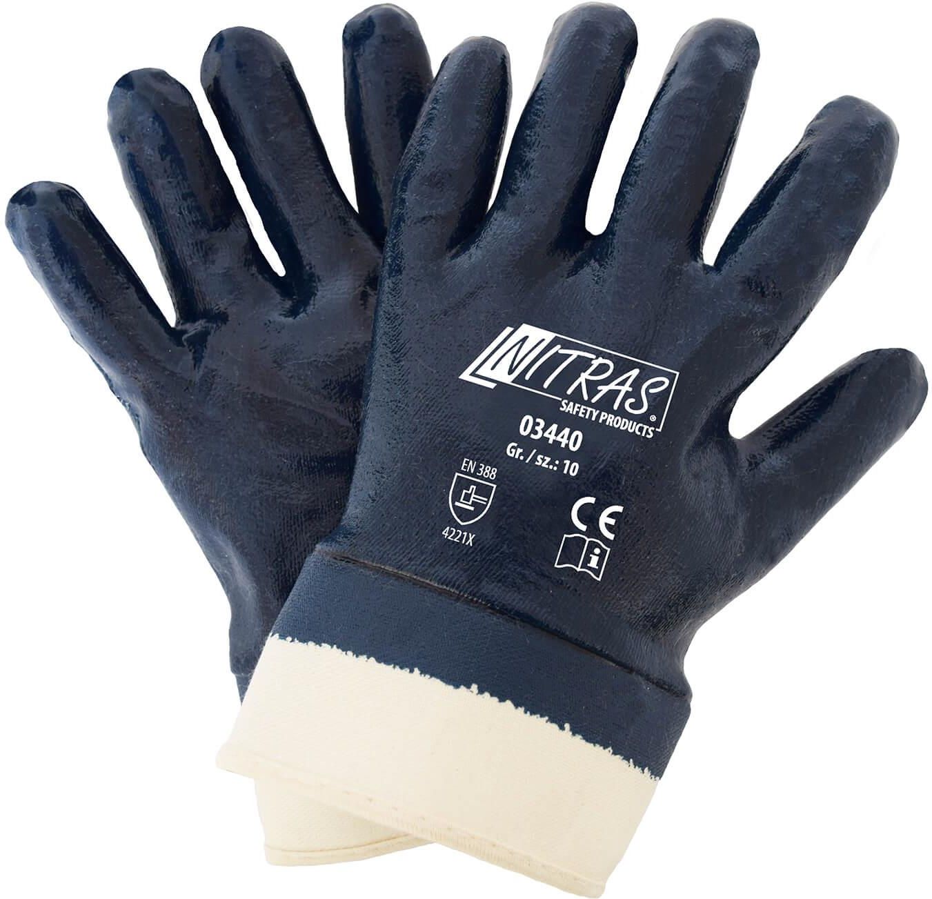 Rękawice robocze nitrylowe Nitras 03440 wykonane z dżerseju bawełnianego w kolorze naturalnym, w całości powleczone nitrylem. Mankiet uszyty został z płótna żaglowego. Rękawice posiadają dziany ściągacz. Materiał: Dżersej bawełniany, nitryl Rozmiar: 8-11 Normy: EN 388 Opak. zbiorcze: 144 pary (12 w opakowaniu)