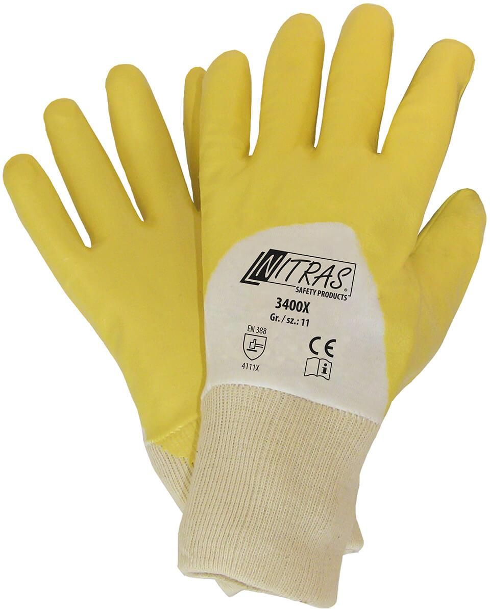 Rękawice robocze nitrylowe Nitras 3400X, wykonane z miękkiego trykotu bawełnianego w kolorze naturalnym. Powleczenie z wysokiej jakości, żółtego nitrylu na ¾ powierzchni gwarantuje dobry chwyt mokrych i zaolejonych powierzchni i jest odporne na ścieranie. Dzięki dzianym ściągaczom Nitras 3400X doskonale dopasowują się do dłoni, zapewniając wysoki komfort użytkowania. Produkt bardzo wysokiej jakości. Cechy i zalety produktu: Powleczenie nitrylowe na ¾ powierzchni Dobry chwyt Odporność na ścieranie Dziany ściągacz Zastosowanie: Przemysł motoryzacyjny Rolnictwo/Ogrodnictwo Przemysł budowlany Prace remontowe Prace magazynowe Materiał: Trykot bawełniany powlekany nitrylem Dostępne rozmiary: 7 - 11 Opakowanie zbiorcze: 144 pary w kartonie (12 par w opakowaniu) Normy i certyfikaty: EN 420 | EN 388 [4111X]