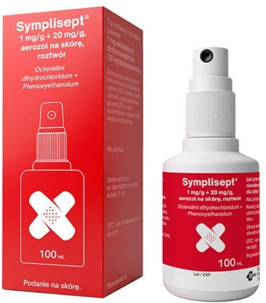 Symplisept 1 mg/g + 20 mg/g aerozol na skórę roztwór 100 ml to lek bez recepty przeznaczony do krótkotrwałego, powtarzalnego wspomagania leczenia antyseptycznego małych, powierzchownych ran u pacjentów w każdym wieku. Jest to preparat na drobne rany, otarcia i skaleczenia. Formuła produktu jest wolna od alkoholu etylowego, co czyni go bezpiecznym wyborem dla osób unikających kontaktu z tą substancją oraz szukających produktów bez charakterystycznego, alkoholowego zapachu. Wskazania do stosowania: Symplisept stosuje się na skórę w celu krótkotrwałego, wielokrotnego wspomagającego leczenia antyseptycznego małych, powierzchownych ran. Skład: Substancjami czynnymi są oktenidyny dichlorowodorek 1 mg/g oraz fenoksyetanol 20 mg/g. Ważna informacja: lek nie zawiera alkoholu etylowego (etanolu). Pozostałe składniki to: kokamidopropylobetaina roztwór 38% zawierający sodu chlorek, sodu glukonian, glicerol 85%, sodu wodorotlenek roztwór 0,4% do ustalenia pH oraz woda oczyszczona. Działanie: Lek zawiera oktenidyny dichlorowodorek oraz fenoksyetanol. Dzięki brakowi alkoholu etylowego w składzie, preparat nie posiada drażniącego zapachu alkoholu, nie wywołuje pieczenia i nie wysusza rany. Po naniesieniu na skórę należy odczekać co najmniej 1 do 2 minut przed dalszym postępowaniem, aby zapewnić odpowiedni czas działania na leczonym obszarze. Dawkowanie: Lek jest przeznaczony wyłącznie do stosowania na skórę. Roztwór należy nanosić na obszar wymagający leczenia do całkowitego zwilżenia. Po zastosowaniu należy odczekać co najmniej 1 do 2 minut przed dalszym postępowaniem, na przykład przed założeniem opatrunku. Nie należy stosować leku częściej niż 3 razy na dobę. Bez konsultacji z lekarzem nie należy stosować leku dłużej niż 2 tygodnie. U dzieci w wieku poniżej 6 lat czas stosowania należy ograniczyć do kilku dni. Działania niepożądane: Nie należy stosować leku w ilościach większych niż to konieczne. Nie należy go połykać ani dopuszczać do przedostania się do krwiobiegu. Należy upewnić się, że roztwór nie jest stosowany pod ciśnieniem w sposób prowadzący do wnikania w tkanki. W przypadku głębokich ran należy zachować ostrożność i zapewnić odpływ treści z rany. Należy unikać kontaktu z oczami. Należy stosować ostrożnie u noworodków, zwłaszcza u wcześniaków. Należy usuwać nadmiar leku i upewnić się, że roztwór nie pozostaje na skórze dłużej niż to konieczne. Interakcje: Nie należy stosować jednocześnie z produktami dezynfekującymi skórę na bazie jodopowidonu na sąsiadujące obszary ciała, ponieważ może to prowadzić do przebarwień skóry. Nie należy stosować jednocześnie z tensydami anionowymi (np. mydłem), ponieważ może to osłabiać działanie leku. Przeciwwskazania: Nie stosować w przypadku nadwrażliwości na oktenidyny dichlorowodorek, fenoksyetanol lub którykolwiek z pozostałych składników leku. Nie stosować do płukania jamy brzusznej w czasie operacji ani pęcherza moczowego oraz nie stosować na błonę bębenkową. Ostrzeżenia i środki ostrożności: Nie należy stosować leku w czasie ciąży. W okresie karmienia piersią nie należy stosować leku na okolice piersi. W razie potrzeby zastosowania należy poradzić się lekarza lub farmaceuty. Producent: Egis Polska Sp. z o.o., ul. Komitetu Obrony Robotników 45D 02-146 Warszawa