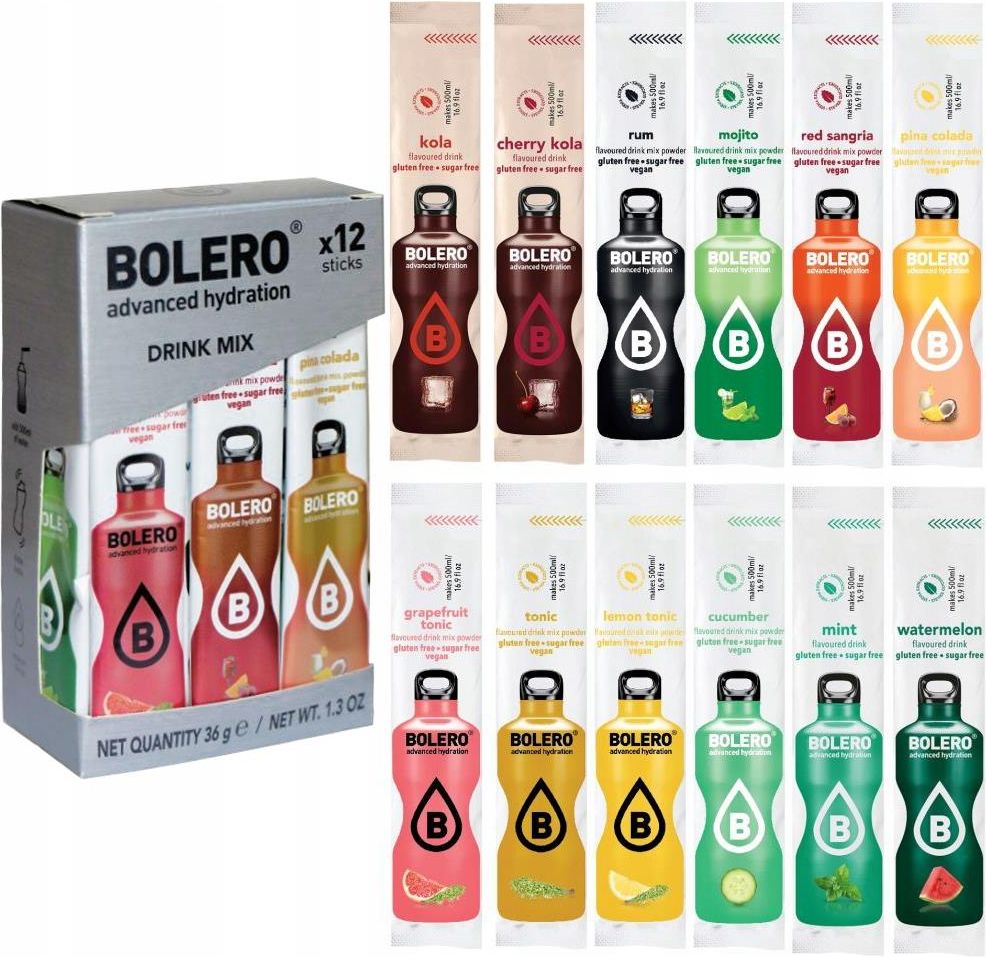 Napoje Bolero Sticks Party Mix 12 sztuk Bolero to niskokaloryczne napoje w formie saszetek, które pozwalają cieszyć się smakiem bez cukru w każdym miejscu. Wystarczy dodać jednego sticka do 0,5 – 1 litra zimnej wody i wymieszać. Napoje Bolero są dostępne w wielu przepysznych smakach i nie zawierają sztucznych barwników, aromatów, konserwantów ani cukru. Zrób nawet 12 litrów napoju, z saszetek Bolero. Mix smaków zawiera: RUM 1 szt. MOJITO 1 szt. RED SANGRIA 1 szt. KOLA 1 szt. CHERRY KOLA 1 szt. WATERMELON 1 szt. PINA COLADA 1 szt. CUCUMBER 1 szt. TONIC 1 szt. LEMON TONIC 1 szt. GRAPEFRUIT TONIC 1 szt. MINT 1 szt. Odkryj napoje w proszku Bolero!Bez cukruOk. 1kcal/100ml.WegańskieOdpowiednie dla diabetykówZawierają elektrolitySłodzone stewiąBez aspartamuPonad 78 niesamowitych smaków! NAPÓJ INSTANT O SMAKU RUMU ZE SŁODZIKAMIZAWARTOŚĆ ROZPUŚCIĆ W 0,5 L DO 1 L WODY LUB WEDŁUG SWOICH UPODOBAŃ SMAKOWYCHSKŁADNIKI:KWASY: KWASEK CYTRYNOWY, KWAS JABŁKOWY; WŁÓKNO INULINOWE; AROMATY;SUBSTANCJE SŁODZĄCE: ACESULFAM K, SUKRALOZA, GLIKOZYDY STEWIOLOWE;REGULATOR KWASOWOŚCI: CYTRYNIAN SODU;SUBSTANCJA PRZECIWZBRYLAJĄCA: FOSFORAN WAPNIA;SUBSTANCJA ZAGĘSZCZAJĄCA: GUMA GUAR, GUMA ARABSKA; KWAS L-ASKORBINOWY (WITAMINA C);BARWNIKI: KARMEL AMONIAKALNO-SIARCZYNOWY ;WARTOŚCI ODŻYWCZE NA 100 ml:WARTOŚĆ ENERGETYCZNA: 8 kJ / 2 kcalTŁUSZCZ: 0 g– W TYM KWASY TŁUSZCZOWE NASYCONE: 0 gWĘGLOWODANY: 0 g– W TYM CUKRY: 0 gBIAŁKO: 0 gSÓL: 0 gWITAMINA C: 6 mg**7,5% RWS – REFERENCYJNA WARTOŚĆ SPOŻYCIA.DATA PRZYDATNOŚCI DO SPOŻYCIA NA GÓRZE SASZETKI.MASA NETTO: 3 g ℮ / 0.106 oz NAPÓJ INSTANT O SMAKU MOJITO ZE SŁODZIKAMIZAWARTOŚĆ ROZPUŚCIĆ W 0,5 L DO 1 L WODY LUB WEDŁUG SWOICH UPODOBAŃ SMAKOWYCHSKŁADNIKI:KWASY: KWASEK CYTRYNOWY, KWAS JABŁKOWY; WŁÓKNO INULINOWE; AROMATY;SUBSTANCJE SŁODZĄCE: ACESULFAM K, SUKRALOZA, GLIKOZYDY STEWIOLOWE;REGULATOR KWASOWOŚCI: CYTRYNIAN SODU;SUBSTANCJA PRZECIWZBRYLAJĄCA: FOSFORAN WAPNIA;SUBSTANCJA ZAGĘSZCZAJĄCA: GUMA GUAR, GUMA ARABSKA; KWAS L-ASKORBINOWY (WITAMINA C);WARTOŚCI ODŻYWCZE NA 100 ml:WARTOŚĆ ENERGETYCZNA: 8 kJ / 2 kcalTŁUSZCZ: 0 g– W TYM KWASY TŁUSZCZOWE NASYCONE: 0 gWĘGLOWODANY: 0 g– W TYM CUKRY: 0 gBIAŁKO: 0 gSÓL: 0 gWITAMINA C: 6 mg**7,5% RWS – REFERENCYJNA WARTOŚĆ SPOŻYCIA.DATA PRZYDATNOŚCI DO SPOŻYCIA NA GÓRZE SASZETKI.MASA NETTO: 3 g ℮ / 0.106 oz NAPÓJ INSTANT O SMAKU CZERWONEJ SANGRII ZE SŁODZIKAMI ZAWARTOŚĆ ROZPUŚCIĆ W 0,5 L DO 1 L WODY LUB WEDŁUG SWOICH UPODOBAŃ SMAKOWYCH SKŁADNIKI: KWASY: KWASEK CYTRYNOWY, KWAS JABŁKOWY; WŁÓKNO INULINOWE; AROMATY; SUBSTANCJE SŁODZĄCE: ACESULFAM K, SUKRALOZA, GLIKOZYDY STEWIOLOWE; REGULATOR KWASOWOŚCI: CYTRYNIAN SODU; SUBSTANCJA PRZECIWZBRYLAJĄCA: FOSFORAN WAPNIA; SUBSTANCJA ZAGĘSZCZAJĄCA: GUMA GUAR, GUMA ARABSKA; KWAS L-ASKORBINOWY (WITAMINA C); BARWNIKI: BARWNIKOWY KONCENTRAT Z MARCHWI ; WARTOŚCI ODŻYWCZE NA 100 ml: WARTOŚĆ ENERGETYCZNA: 8 kJ / 2 kcal TŁUSZCZ: 0 g – W TYM KWASY TŁUSZCZOWE NASYCONE: 0 g WĘGLOWODANY: 0 g – W TYM CUKRY: 0 g BIAŁKO: 0 g SÓL: 0 g WITAMINA C: 6 mg* *7,5% RWS – REFERENCYJNA WARTOŚĆ SPOŻYCIA. DATA PRZYDATNOŚCI DO SPOŻYCIA NA GÓRZE SASZETKI. MASA NETTO: 3 g ℮ / 0.106 oz NAPÓJ INSTANT O SMAKU COLI ZE SŁODZIKAMIZAWARTOŚĆ ROZPUŚCIĆ W 0,5 L DO 1 L WODY LUB WEDŁUG SWOICH UPODOBAŃ SMAKOWYCHSKŁADNIKI:KWASY: KWASEK CYTRYNOWY, KWAS JABŁKOWY; WŁÓKNO INULINOWE; AROMATY;SUBSTANCJE SŁODZĄCE: ACESULFAM K, SUKRALOZA, GLIKOZYDY STEWIOLOWE;REGULATOR KWASOWOŚCI: CYTRYNIAN SODU;SUBSTANCJA PRZECIWZBRYLAJĄCA: FOSFORAN WAPNIA;SUBSTANCJA ZAGĘSZCZAJĄCA: GUMA GUAR, GUMA ARABSKA; KWAS L-ASKORBINOWY (WITAMINA C);BARWNIKI: KARMEL AMONIAKALNO – SIARCZYNOWY;WARTOŚCI ODŻYWCZE NA 100 ml:WARTOŚĆ ENERGETYCZNA: 5 kJ / 2 kcalTŁUSZCZ: 0 g– W TYM KWASY TŁUSZCZOWE NASYCONE: 0 gWĘGLOWODANY: 0 g– W TYM CUKRY: 0 gBIAŁKO: 0 gSÓL: 0 gWITAMINA C: 6 mg**7,5% RWS – REFERENCYJNA WARTOŚĆ SPOŻYCIA.DATA PRZYDATNOŚCI DO SPOŻYCIA NA GÓRZE SASZETKI.MASA NETTO: 3 g ℮ / 0.106 oz NAPÓJ INSTANT O SMAKU COLI WIŚNIOWEJ ZE SŁODZIKAMIZAWARTOŚĆ ROZPUŚCIĆ W 0,5 L DO 1 L WODY LUB WEDŁUG SWOICH UPODOBAŃ SMAKOWYCHSKŁADNIKI:KWASY: KWASEK CYTRYNOWY, KWAS JABŁKOWY; WŁÓKNO INULINOWE; AROMATY;SUBSTANCJE SŁODZĄCE: ACESULFAM K, SUKRALOZA, GLIKOZYDY STEWIOLOWE;REGULATOR KWASOWOŚCI: CYTRYNIAN SODU;SUBSTANCJA PRZECIWZBRYLAJĄCA: FOSFORAN WAPNIA;SUBSTANCJA ZAGĘSZCZAJĄCA: GUMA GUAR, GUMA ARABSKA; KWAS L-ASKORBINOWY (WITAMINA C);BARWNIKI: KONCENTRAT Z MARCHWIWARTOŚCI ODŻYWCZE NA 100 ml:WARTOŚĆ ENERGETYCZNA: 7 kJ / 2 kcalTŁUSZCZ: 0 g– W TYM KWASY TŁUSZCZOWE NASYCONE: 0 gWĘGLOWODANY: 0 g– W TYM CUKRY: 0 gBIAŁKO: 0 gSÓL: 0 gWITAMINA C: 6 mg**7,5% RWS – REFERENCYJNA WARTOŚĆ SPOŻYCIA.DATA PRZYDATNOŚCI DO SPOŻYCIA NA GÓRZE SASZETKI.MASA NETTO: 3 g ℮ / 0.106 oz NAPÓJ INSTANT O SMAKU ARBUZOWYM ZE SŁODZIKAMIZAWARTOŚĆ ROZPUŚCIĆ W 0,5 L DO 1 L WODY LUB WEDŁUG SWOICH UPODOBAŃ SMAKOWYCHSKŁADNIKI:KWASY: KWASEK CYTRYNOWY, KWAS JABŁKOWY; WŁÓKNO INULINOWE; AROMATY;NATURALNE AROMATYSUBSTANCJE SŁODZĄCE: ACESULFAM K, SUKRALOZA, GLIKOZYDY STEWIOLOWE;REGULATOR KWASOWOŚCI: CYTRYNIAN SODU;SUBSTANCJA PRZECIWZBRYLAJĄCA: FOSFORAN WAPNIA;SUBSTANCJA ZAGĘSZCZAJĄCA: GUMA GUAR, GUMA ARABSKA; KWAS L-ASKORBINOWY (WITAMINA C);BARWNIKI: KONCENTRAT Z MARCHWIWARTOŚCI ODŻYWCZE NA 100 ml:WARTOŚĆ ENERGETYCZNA: 9 kJ / 2 kcalTŁUSZCZ: 0 g– W TYM KWASY TŁUSZCZOWE NASYCONE: 0 gWĘGLOWODANY: 0 g– W TYM CUKRY: 0 gBIAŁKO: 0 gSÓL: 0 gWITAMINA C: 6 mg**7,5% RWS – REFERENCYJNA WARTOŚĆ SPOŻYCIA.DATA PRZYDATNOŚCI DO SPOŻYCIA NA GÓRZE SASZETKI.MASA NETTO: 3 g ℮ / 0.106 oz NAPÓJ INSTANT O SMAKU PINA COLADY ZE SŁODZIKAMIZAWARTOŚĆ ROZPUŚCIĆ W 0,5 L DO 1 L WODY LUB WEDŁUG SWOICH UPODOBAŃ SMAKOWYCHSKŁADNIKI:KWASY: KWASEK CYTRYNOWY, KWAS JABŁKOWY; WŁÓKNO INULINOWE; AROMATY;SUBSTANCJE SŁODZĄCE: ACESULFAM K, SUKRALOZA, GLIKOZYDY STEWIOLOWE;REGULATOR KWASOWOŚCI: CYTRYNIAN SODU;SUBSTANC