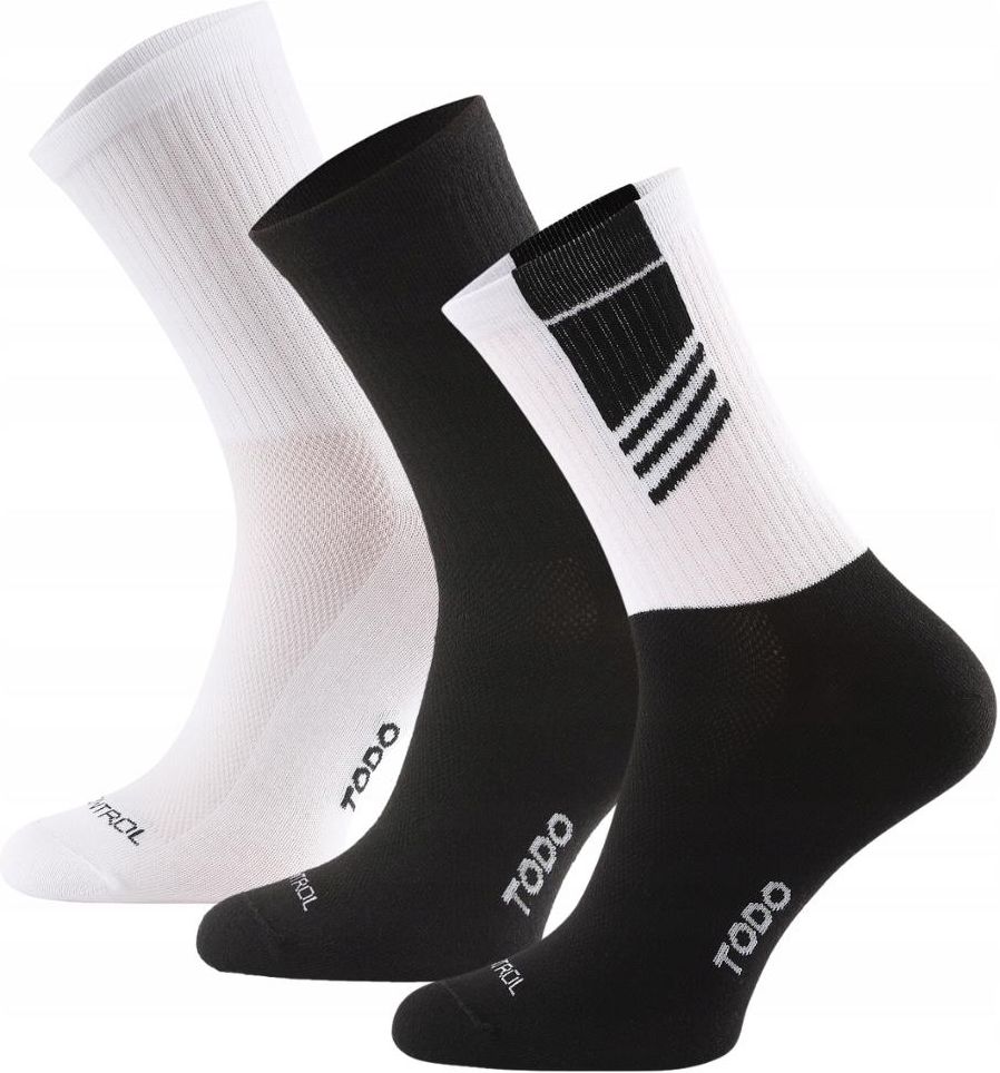 Zestaw termoaktywnych skarpetek sportowych z bawełny czesanej z systemem Air Control Rozmiar: 39-42 Kolor: Czarny Mix Opis Termoaktywne skarpetki TODO to idealny model dla osób aktywnych. Ta sportowa skarpeta doskonale sprawdzi się w trakcie uprawiania różnych dyscyplin sportowych między innymi: biegania, sportów halowych. Nasi klienci używają również tego modelu na co dzień ze względu na właściwości termoaktywne. Właściwości i cechy produktu W skarpetkach TODO Twoje stopy nie będą się pocić. Ten model zapewnia doskonałą cyrkulację powietrza, nawet w trakcie upalnych dni. Polski producent TODO zastosował system wplatania włókien AIR CONTROL, który zapewnia optymalną cyrkulację powietrza oraz szybkie odprowadzanie wilgoci. Dzięki niemu Twoja skóra pozostanie sucha. Zastosowanie najwyższej jakości bawełny czesanej, oraz odpowiednie rozmieszczenie przędzy, gwarantuje 100% komfort w trakcie uprawiania aktywności fizycznej. Wykonana z bawełny czesanej przez co jest bardzo wytrzymała i nie mechaci się po upływie czasu. Skarpeta posiada anatomiczne dopasowanie do lewej oraz prawej stopy. Marka TODO projektuje oraz produkuje skarpety w Polsce. Ich produkty charakteryzują się najwyższą jakością oraz niebanalnym designem. Skarpety z serii FOR SPORT cechuje wyjątkowa wytrzymałość oraz doskonałe właściwości termoaktywne. Komfort w trakcie wykonywania aktywności jest dla Ciebie najważniejszy? Wybierz ten model skarpet. Skład 70% Bawełna czesana 25% Poliamid 5% Elastan Jak dbać o produkt? Pranie w temperaturze nieprzekraczającej 40°C, Nie wybielać, Nie suszyć bębnowo, Nie prasować, Nie czyścić chemicznie.