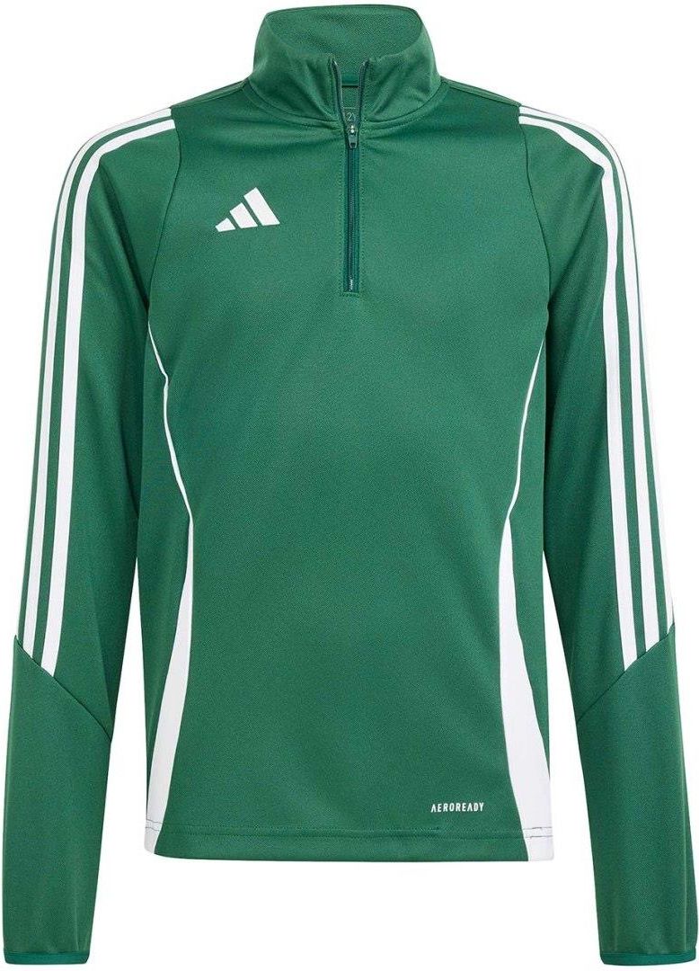 Bluza dla dzieci adidas Tiro 24 Training Top zielona IR9362 Bluza piłkarska adidas przeznaczona dla dzieci sprawdzi się podczas treningów. Wysoka stójka. Zamek sięgający do połowy piersi. Dopasowany krój. Technologia Aeroready pomaga osuszać skórę i zwiększa wygodę. Paski na rękawach. Subtelne logo. Materiał: 100% poliester z recyklingu