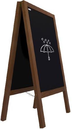 WODOODPORNY potykacz stojak kredowy 150x61 cm POWIERZCHNIA - potykacz wyposażony jest w czarną, kredową tablicę do pisania, wykonaną z tworzywa sztucznego ABS. Zapewnia jej to pełną odporność na wodę! Jest bardzo trwała, można po niej pisać kredą oraz markerami kredowymi. Płyta znajduje się z obu stron produktu, co czyni go dwustronnym! RAMA - potykacz wykonany jest z wysokiej jakości drewna. Zostało ono polakierowane, co zapewnia mu elegancki brązowy kolor oraz wodoodporność, zachowująć przy tym naturalną strukturę drewna i układ słojów. WYKORZYSTANIE - stojak kredowy jest doskonałym nośnikiem reklamy i informacji. Dzięki powierzchni wielokrotnego użytku, można umieszczać tam na bieżąco informacje o lokalu, aktualne menu, specjalne oferty, wskazówki na temat dotarcia do lokalu lub firmy. UNIWERSALNY - potykacz reklamowy pasuje do każdego miejsca! Wykorzystasz go w: restauracji, firmie, lokalu, barze, kawiarni, kwiaciarni, lodziarni. Jest też świetną tablicą do wykorzystania w domu, jako tablica kreatywna dla dziecka! GOTOWY DO UŻYCIA - potykacz jest gotowy do użycia natychmiast po wyjęciu z pudełka. Nie musisz nic skręcać, sklejać ani łączyć! Zapewniamy komfortowe i łatwe użytkowanie! POLSKA PRODUKCJA - nasz potykacz to produkt w pełni zaprojektowany i wyprodukowany w Polsce. Stworzony z pasją, co zapewnia wysoką jakość i dbałość o szczegóły. Jest niezawodnym rozwiązaniem dla Twojej firmy! Wymiary szerokość całkowita: 61 cm wysokość całkowita: 150 cm rozmiar wewnętrzny: 120x53 cm szerokość listwy: 4 cm grubość listwy: 2 cm wysokość nóżki: 23 cm W zestawie znajduje się również łańcuszek połączeniowy! Solidna konstrukcja Sercem potykacza jest solidna drewniana lakierowana konstrukcja. Przykuwa uwagę Klienta i zapewnia długie użytkowanie bez utraty walorów estetycznych. Uniwersalny i praktyczny Potykacz firmy ALLboards jest bardzo uniwersalny. Możesz wykorzystać go wszędzie gdzie tylko zechcesz, w szczególności: w restauracji w sklepie w kawiarni w kwiaciarni w pubie w barze Jego elegancki wygląd pasuje również do wykorzystania wewnątrz firmy czy też prywatnego domu! Nośnik informacji Dzięki potykaczowi przekażesz swoim Klientom wszystkie niezbędne informacje: informacje o swoim lokalu menu specjalne oferty wskazówki na temat dotarcia do lokalu/firmy Nic nie stoi na przeszkodzie, aby potykacz ozdobić również przykuwającymi uwagę rysunkami! UWAGA Nasze wodoodporne potykacze kupują Państwo gotowe do użytkowania, przed wilgocią drewno jest zabezpieczone za pomocą impregnatu, który wnika głęboko w strukturę materiału i dobrze chroni go przed szkodliwym wpływem czynników atmosferycznych. Aby jednak potykacz służył wiele lat, najlepiej co roku, przed rozpoczęciem sezonu, impregnować go we własnym zakresie. Jak to zrobić? Przed rozpoczęciem impregnacji rama potykacza powinna być sucha i oczyszczona. Następnie postępujemy zgodnie z zaleceniami zamieszczonymi na etykiecie impregnatu. Większość z nich można nakładać pędzlem, wykonując długie płynne pociągnięcia zgodnie z kierunkiem usłojenia. Czas schnięcia wynosi od kilku do kilkudziesięciu godzin, zależnie od wyrobu.
