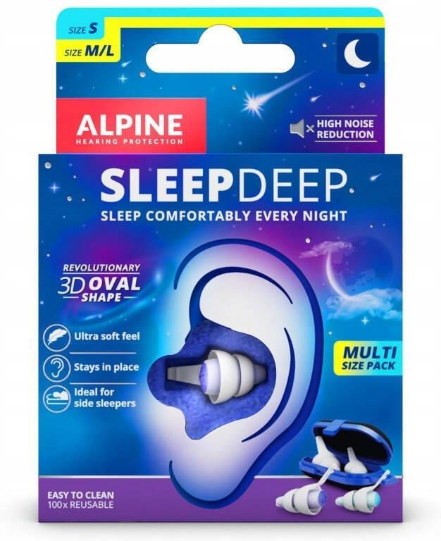 Najważniejsze cechy:• wysoki komfort użytkowania• owalny kształt dopasowuje się do naturalnego kształtu przewodu słuchowego• wykonane z wysokiej jakości, miękkiego i łatwego do czyszczenia materiału termoplastycznego AlpineThermoShape, który jest hipoalergiczny• wielorazowe stopery do uszu w rozmiarze S oraz M/L w jednym opakowaniu Wysoki komfort użytkowaniaZatyczki do uszu SleepDeep to bardzo wygodne stopery zapewniające głęboki i spokojny sen. Specjalnie zaprojektowany owalny kształt dopasowuje się do naturalnego kształtu przewodu słuchowego, dzięki czemu zatyczki pozostają na swoim miejscu przez całą noc. Idealnie sprawdzą się u osób, które lubią spać na boku. Zatyczki zostały wykonane z wysokiej jakości, miękkiego i łatwego do czyszczenia materiału termoplastycznego AlpineThermoShape, który jest hipoalergiczny. Poprzez brak silikonów nie powoduje uciążliwego swędzenia ani innych niepożądanych reakcji alergicznych. Specjalny żel redukujący szumySleepDeep ALPINE zawierają specjalny żel redukujący szumy, co skutkuje maksymalnym tłumieniem oraz ułatwia zasypianie jak i zapobiega łatwemu wybudzaniu. Średnie tłumienie (SNR) zatyczek wynosi 27 dB. Żywotność zatyczek ALPINE zależy od częstotliwości ich użytkowania oraz pielęgnacji. Stopery ulegają naturalnemu zużyciu. Producent gwarantuje niezmienność parametrów podczas stu pierwszych aplikacji. Utrzymywanie zatyczek do uszu w czystości wydłuży ich żywotność. Zalecamy stosowanie płynu ALPINE Clean Spray lub można je czyścić pod letnią wodą z mydłem. Następnie należy je odstawić do całkowitego wyschnięcia. W opakowaniu znajdują się zatyczki do uszu SleepDeep w rozmiarze S oraz w rozmiarze M/L wraz z podróżnym etui.