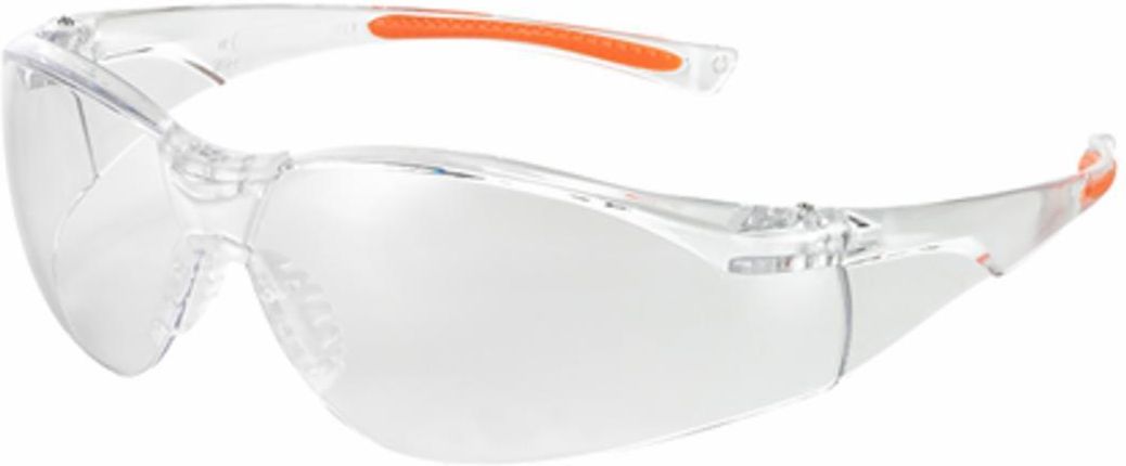 E42 Kolorowe zauszniki z hipoalergiczną powłoką gumową. Dobrze dopasowujące się. Rzeciwślizgowy gumowy mostek nosowy. Ochrona brwi. Kolor soczewki: bezbarwny. Kolor oprawek: bezbarwny/pomarańczowy. Właściwości soczewek:. Powłoka powierzchni przeciw zarysowaniu.