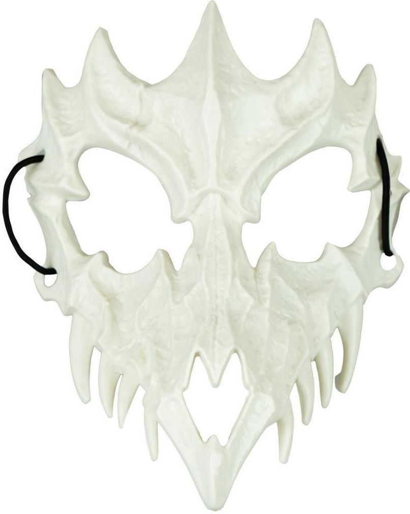 Maska czaszka - smok Wymiary: 18 15 cm Zawartość: 1 sztuka Upiorna maska w kształcie czaszki smoka to wyjątkowy dodatek do przebrań fantasy, stylizacji z horrorów oraz halloweenowych kostiumów. Jej ostre krawędzie, kolczaste wykończenia i smoczy kształt tworzą efekt mrocznego, legendarnego stworzenia, idealnego na imprezy przebierane lub klimatyczne sesje zdjęciowe. Charakterystyka produktu: Wzór: czaszka smoka - z ostrymi detalami i imitacją rogów. Kolor: biały. Materiał: plastik. Mocowanie: elastyczna gumka. Dopasowanie: maska nie zasłania widzenia. Zastosowanie: Halloween - do przebrań smoka, demona, potwora fantasy. Cosplay i LARP - jako element kostiumu postaci z mrocznego uniwersum. Imprezy tematyczne i wieczory grozy. Teatr i sesje zdjęciowe - mocny akcent sceniczny lub fotograficzny. Dekoracja - nadaje się także jako ozdoba ścienna lub rekwizyt. Dzięki wyrazistemu kształtowi i ostrej estetyce, maska smoka tworzy efekt tajemniczości, siły i grozy. Świetna zarówno jako gadżet imprezowy, jak i rekwizyt sceniczny.