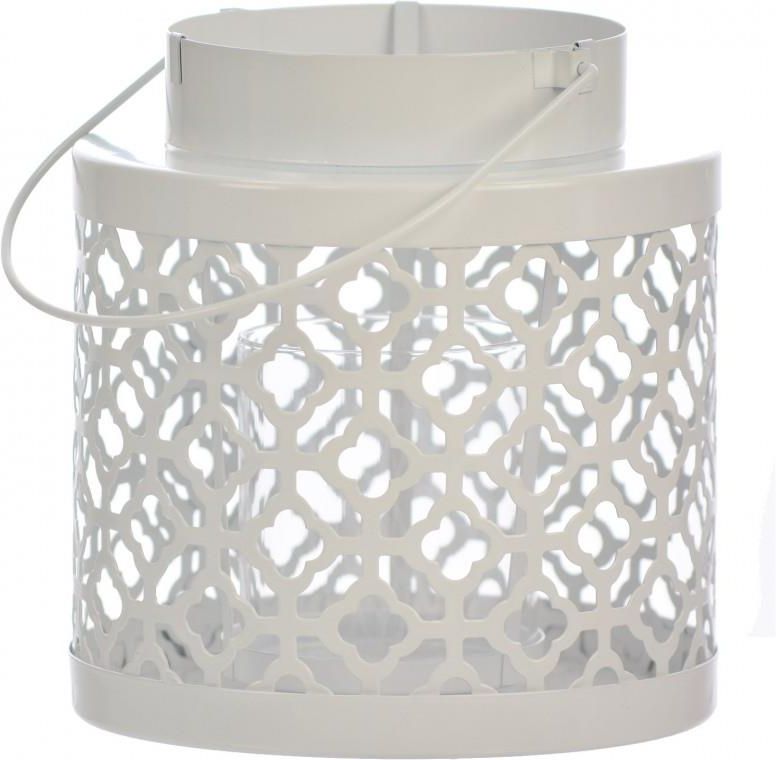 Orientalny lampion metalowy biały PORTAVELA, wykonany z metalu malowanego w kolorze białym. Lampion posiada szklany wkład na świeczkę i metalowy uchwyt, dzięki czemu można go powiesić. Wymiary: Średnica: 15 cm Wysokość: 16 cm