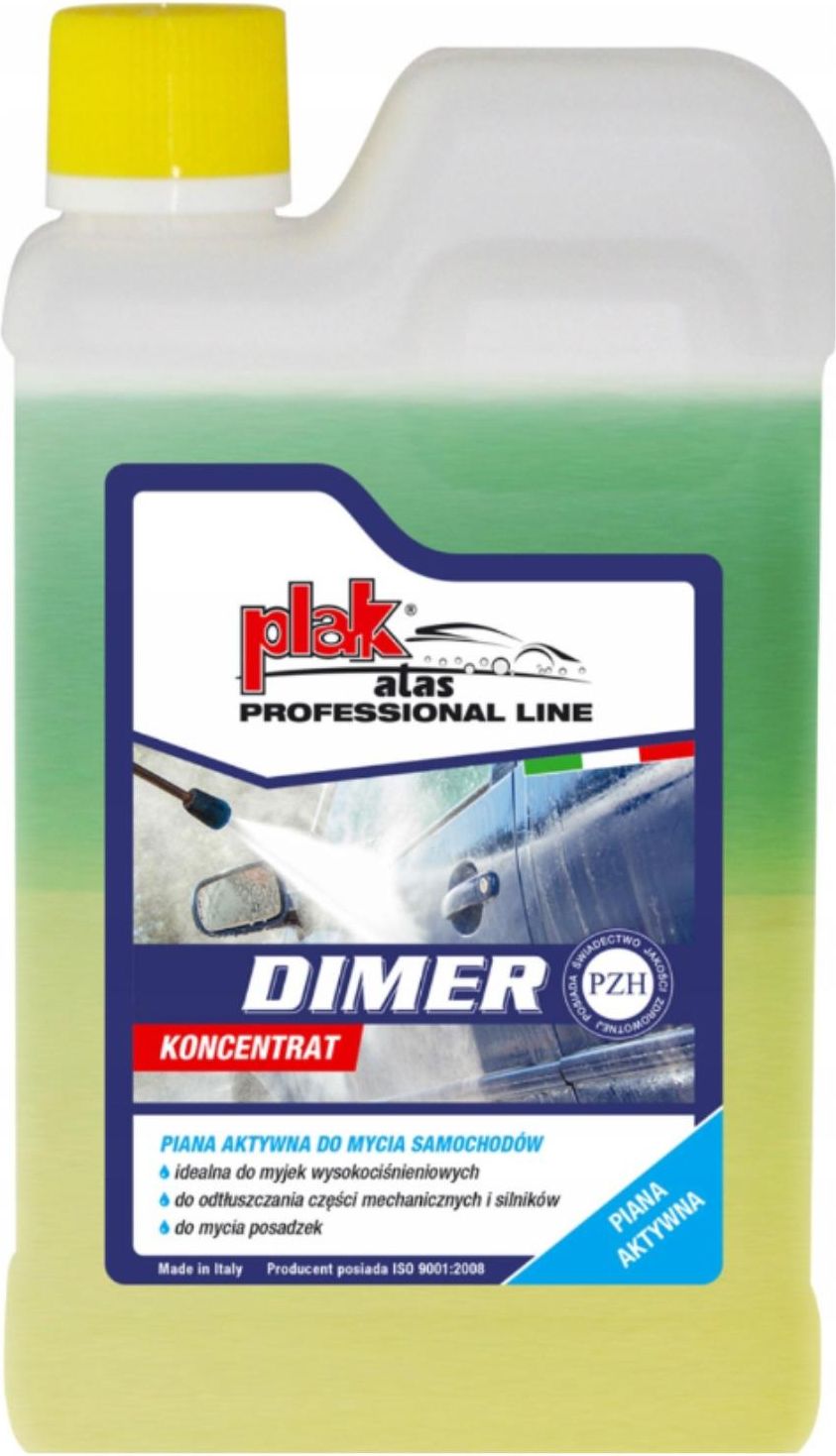 Atas Dimer Piana Aktywna Koncentrat 1 kg - profesjonalny środek do mycia samochodów i powierzchni przemysłowych Profesjonalny preparat do mycia i odtłuszczania pojazdów ATAS DIMER to dwuskładnikowy koncentrat pianotwórczy o wyjątkowych właściwościach odtłuszczających i bardzo szerokim zastosowaniu. Stworzony z myślą o myciu zarówno samochodów osobowych, jak i ciężarowych, a także naczep, kontenerów, plandek, podwozi i zewnętrznych części silników. Produkt z powodzeniem stosowany jest również w przemyśle – do czyszczenia posadzek, maszyn i wagonów kolejowych. Dzięki silnie skoncentrowanej formule DIMER skutecznie usuwa tłuste zabrudzenia, olej, smog, kurz i osady drogowe, pozostawiając powierzchnię idealnie czystą. Może być stosowany zarówno w postaci piany aktywnej, jak i oprysku. Najważniejsze zalety ATAS DIMER dwuskładnikowa formuła – doskonałe właściwości odtłuszczające, uniwersalne zastosowanie – samochody osobowe, ciężarowe, naczepy, maszyny przemysłowe, posadzki, bez fosforanów – bezpieczny dla środowiska i lakieru, skuteczny na ciężkie zabrudzenia – usuwa smar, olej, sadzę i trudne osady drogowe, wydajny koncentrat – małe zużycie, duża efektywność. Zastosowanie mycie karoserii samochodów osobowych i ciężarowych (TIR, dostawczych), czyszczenie naczep, kontenerów, plandek, podwozi i kół, usuwanie zanieczyszczeń z zewnętrznych części silników, czyszczenie posadzek, lastryko oraz maszyn przemysłowych, mycie wagonów kolejowych i elementów aluminiowych. Sposób użycia Dokładnie wymieszać preparat do uzyskania jednolitej barwy. Rozcieńczyć z wodą w odpowiednich proporcjach: Mycie wstępne: 1:70–100 Mycie główne: 1:40–50 Lanca pianotwórcza: 1:3 Podwozia, koła i silniki: 1:6–10 Rozpylić roztwór przy pomocy urządzenia ciśnieniowego lub pianownicy. Odczekać około 30 sekund. Spłukać obficie wodą.