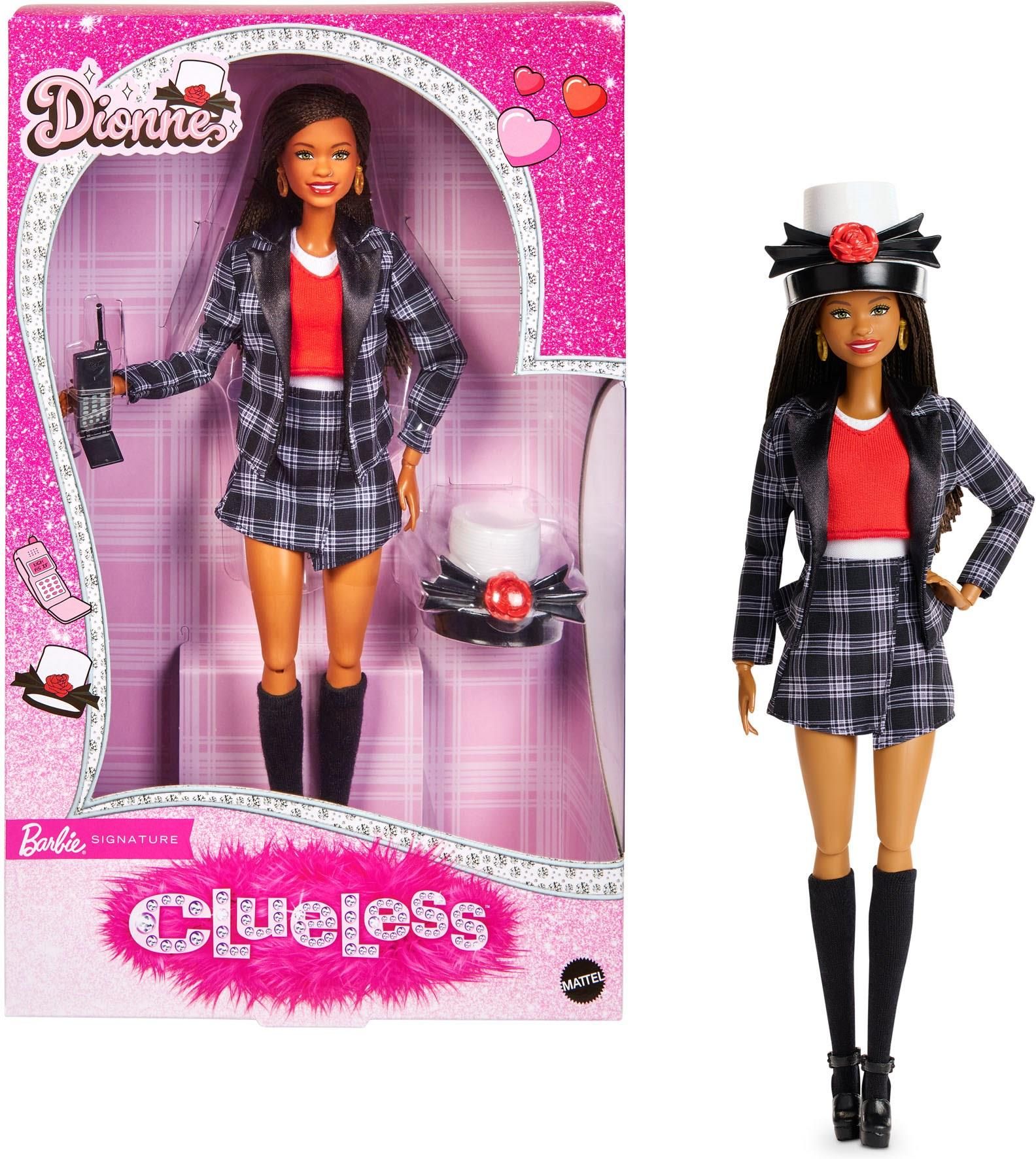 Mattel Barbie Signature Clueless Słodkie zmartwienia Dionne Lalka kolekcjonerska w czarno-białym stroju w kratkę, kapelusz cylinder i „komórka”, zabawka dla dzieci 6+ Ta kolekcjonerska lalka Barbie Signature Dionne upamiętnia 30. rocznicę premiery filmu „Słodkie zmartwienia”. Nieustraszona …
