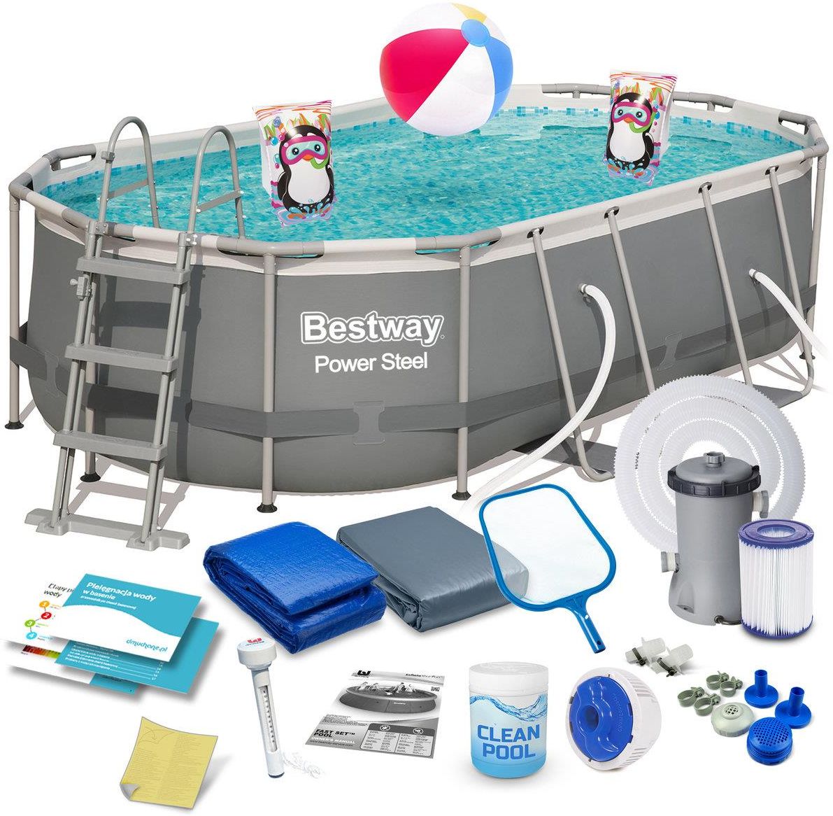 Basen ogrodowy stelażowy Power Steel 427 x 250 x 100 cm ★★★★★ Zestaw 18w1 Nr katalogowy BESTWAY ® 56620 Idealny basen do Twojego ogrodu Jeśli potrzebujesz dużego, niezawodnego basenu,- to idealny wybór dla Ciebie! Gotowy zestaw z kompletnym wyposażeniem – nie musisz sam szukać wszystkich elementów. Kupując basen Bestway z dedykowanymi akcesoriami masz pewność, że otrzymasz najwyższą jakość i wszystko będzie do siebie pasować. ZAWARTOŚĆ ZESTAWU Basen stelażowy427x 250 x 100 cm Pompa filtrująca Filtr do pompy typu II Tabletki multifunkcyjne Dozownik chemii Bezpieczna drabinka Pokrywa basenowa Mata pod basen Piłka dmuchana Rękawki do pływania Siatka do wyławiania zanieczyszczeń Termometr pływający Sitka do pompy Zaciski do pompy Węże do pompy Łatka naprawcza Instrukcja w języku polskim Przewodnik - do pobrania w aukcji KUPUJ U AUTORYZOWANEGO SPRZEDAWCY Zyskujesz serwis gwarancyjny i pogwarancyjny, dostęp do najbogatszego wyboru akcesoriów, pomoc wyspecjalizowanego personelu, informacje i sprawdzone porady dotyczące użytkowania, zawsze nowe i najwyższej jakości produkty 15 lat doświadczenia na rynku! Ponad 2 mln obsłużonych klientów — oznacza to, że statystycznie co najmniej jeden z Twoich sąsiadów kupił u nas basen ogrodowy lub akcesoria basenowe. Bezpieczeństwo dziecka Odłączane stopnie uniemożliwiają wejście dzieciom bez opieki Wysokość idealnie dobrana do wielkości basenu Wzmocniony metalowy stelaż odporny na korozje Antypoślizgowe stopnie Wygodne poręcze Najwyższa jakość wykonania Wytrzymały 3 warstwowy materiał PVC Wzmocnienie z nylonowej siatki pomiędzy warstwami Powłoka odporna na przebicia Wnętrze imitujące mozaikę w kolorze biało-niebieskim Pokrywa Zabezpiecza wodę w basenie przed zabrudzeniami Uniemożliwia dzieciom wejście do basenu bez Twojej zgody Spowalnia utratę ciepła z wody Mata Zabezpiecza dno przed uszkodzeniem Chroni przed wnoszeniem do basenu piasku i innych zabrudzeń Izoluje basen od podłoża Przepływowy dozownik chemii Chemconnect Aplikowanie chemii basenowej nigdy nie było tak bezpieczne! Zintegrowany, automatyczny, przepływowy dozownik chloru w basenie nie wymaga manualnej obsługi. Urządzenie działa wraz z pompą jednolicie rozprzestrzeniając chlor w twoim basenie. DANE TECHNICZNE Basen Wymiary niecki basenowej 427 x 250 x 100 cm Wymiary zewnętrzne basenu 427 x 290 x 100 cm Pojemność 7 250 litrów Pompa Wydajność pompy 2 006 litrów/godz Zasilanie pompy 220 - 240 V Filtr do pompy typ II (58094) Spraw by to lato było pełne cudownych wrażeń!