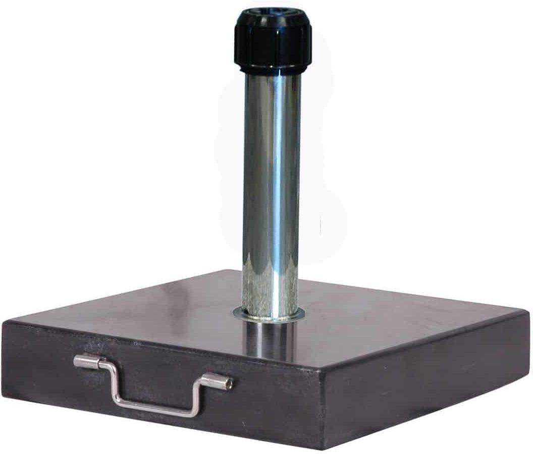 Stojak na parasol ogrodowy Rome/Lucca 40kg – staranność wykonania, wysoka odporność Stojak do parasola ogrodowego utrzyma go w ryzach i sprawi, że będzie stał stabilnie. Pamiętajmy jednak, że nawet najcięższa podstawa parasola lub jego przytwierdzenie na stałe do podłoża, nie gwarantuje podczas silnych podmuchów wiatru zachowania stabilności rozłożonego parasola. W celu uniknięcia uszkodzeń mechanicznych, podczas wiatru lub braku w pobliżu parasola osoby dorosłej należy: złożyć parasol zabezpieczyć czaszę parasola taśmą zapobiegającą samoistnemu otworzeniu się parasola, będącej integralną częścią każdego parasola w celu uniknięcia przemieszczania się parasola po powierzchni na której stoi, w podstawach z kółkami należy zablokować kółka hamulcem, w które są wyposażone zaleca się używanie pokrowca ochronnego, będącego dodatkowym zabezpieczeniem czaszy parasola. Pozostawienie rozłożonego parasola bez opieki osoby dorosłej lub podczas wiatru, może skutkować uszkodzeniem parasola oraz osób i rzeczy znajdujących się w jego pobliżu. Podstawa jest kompatybilna ze wszystkimi parasolami Platinum RIVA. WŁAŚCIWOŚCI Podstawy do parasola ROME/LUCCA 40kg materiał – czarny grafit polerowany; dwa kółka wym. 45 x 45 x 12,5 cm; waga 40 kg Wymiary 45 x 45 x 12.5 cm