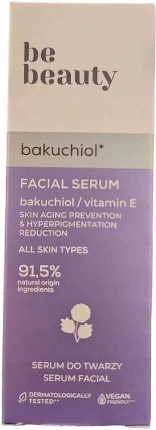 Be Beauty Serum do twarzy z bakuchiolem vegan 30 ml Serum do twarzy z bakuchiolem. Serum o właściwościach odżywczych, ujędrniających i antyoksydacyjnych dla skóry. Serum skomponowane ze składników, które nawilżają i pomagają odmłodzić skórę. Gliceryna: znana z nawilżających właściwości Witamina E: przeciwutleniacz Kwas hialuronowy: wielka moc nawilżenia, regeneracja i wyrównanie kolorytu skóry. Pomaga wypełnić zmarszczki poprzez redukcję starzenia Przywraca naturalny blask oraz zapewnia uczucie świeżości i czystości skóry. Skutecznie usuwa makijaż pozostawiając skórę delikatnie miękką. Nie pozostawia uczucia ściągniętej skóry. Sposób użycia: Nałożyć na czystą skórę twarzy, szyi, delikatnie masując aż do całkowitego wchłonięcia. Nakładać rano i wieczorem. Zawartość: 30 ml 91,5% składników pochodzenia naturalnego Vegański
